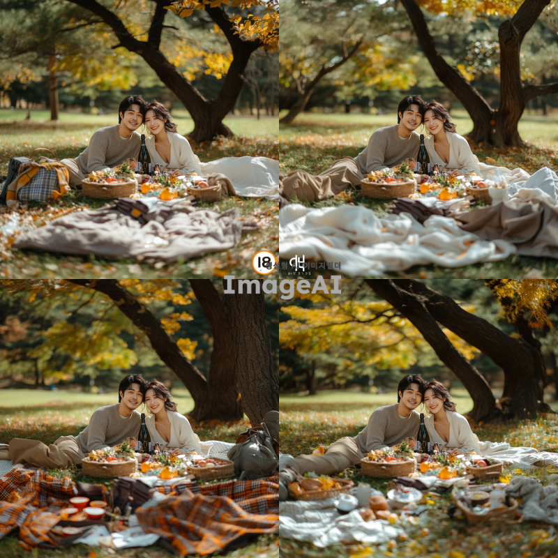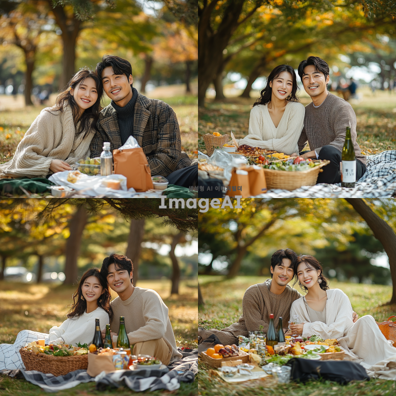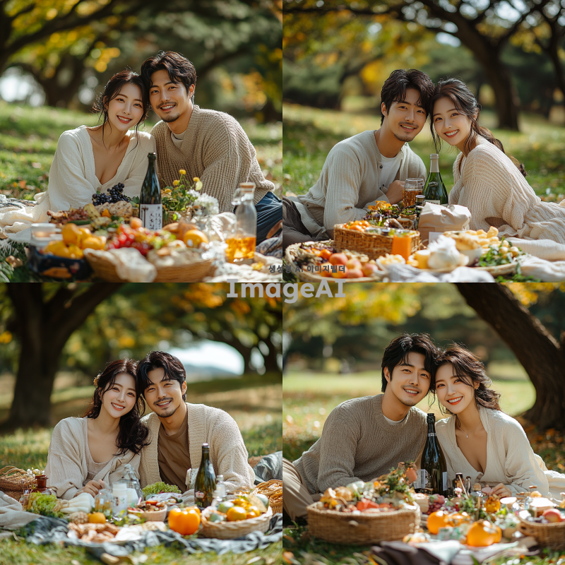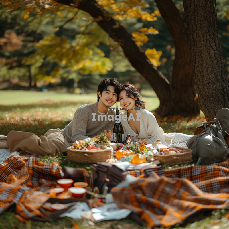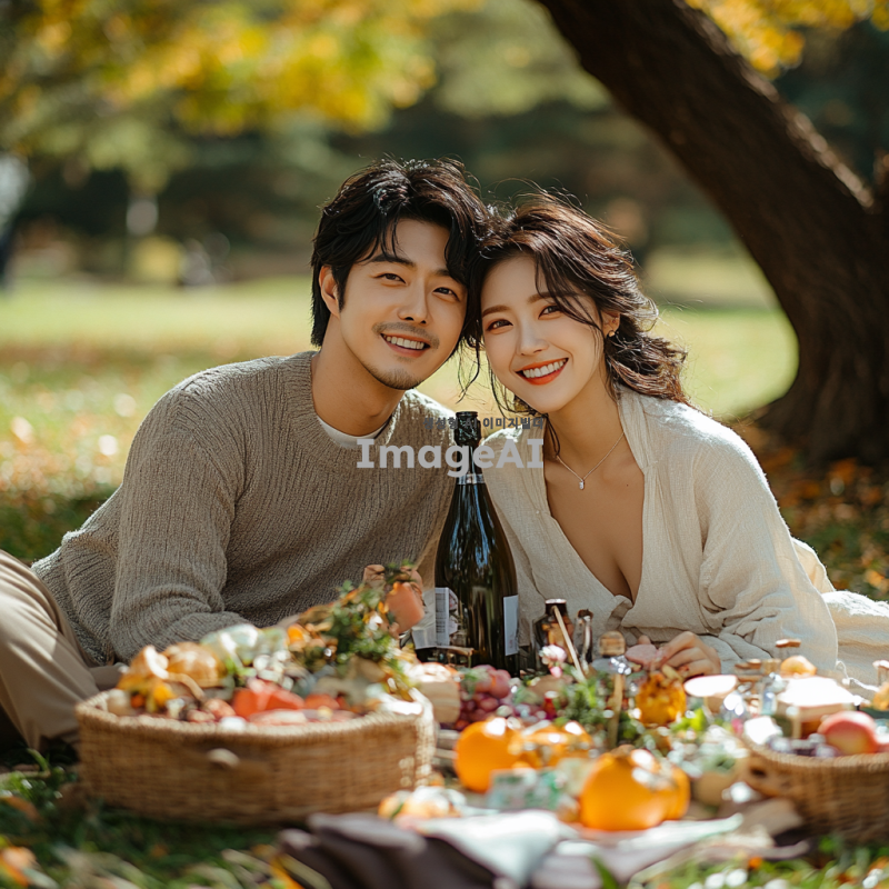 한국인 남녀가 서로 등을 맞대고 즐거운 피크닉. 자연속에서 즐겁게 즐긴다. DSLR, 캐논. 글자는 나오지 않게.