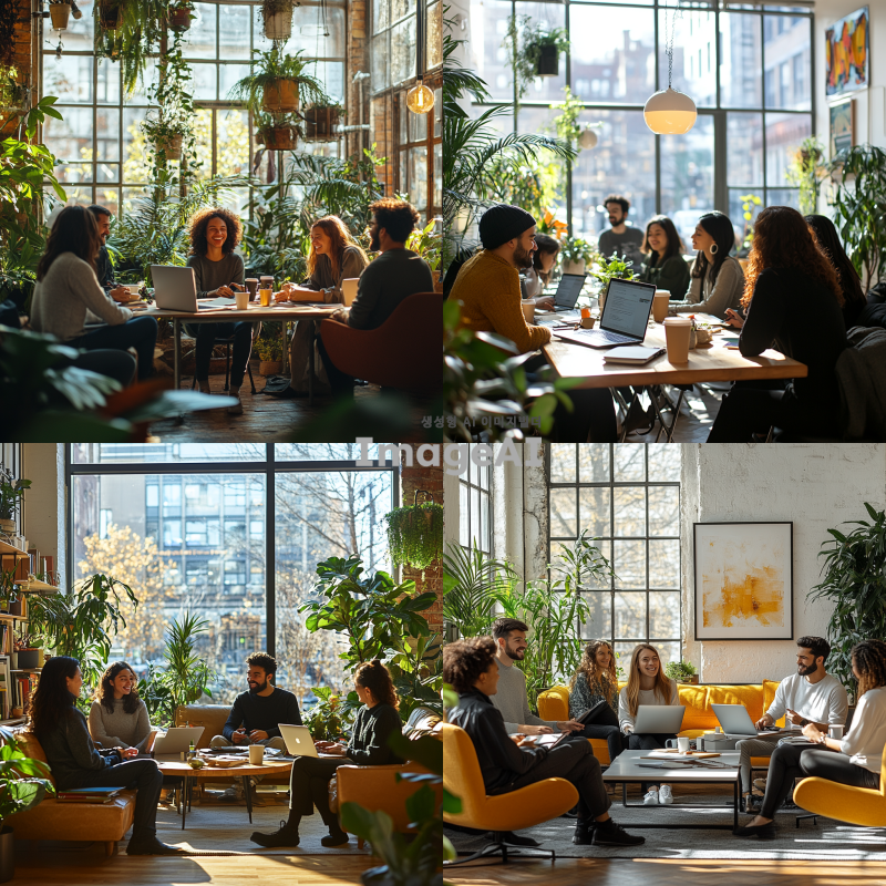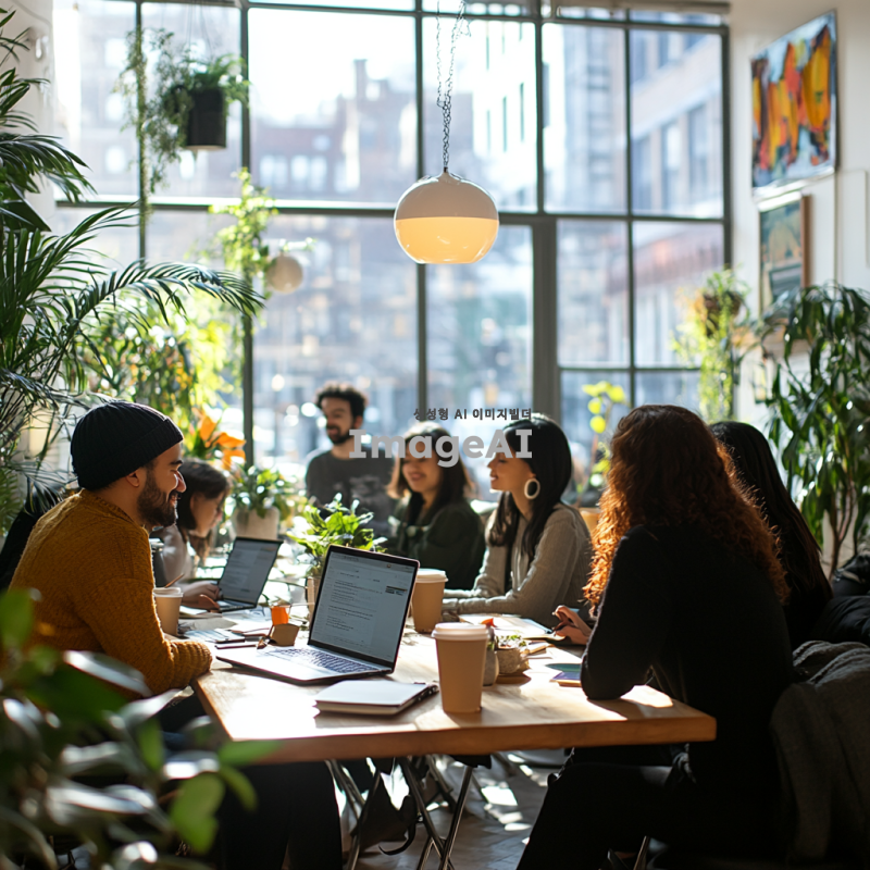 밝고 자유로운 분위기의 사무실에서 다양한 사람들이 모여 회의하는 장면, 현대적인 가구와 식물들이 배치된 공간, 사람들이 편안한 자세로 앉거나 서서 대화를 나누며 웃고 있는 모습, 창문을 통해 자연광이 들어오는 따뜻한 분위기, 각기 다른 문화적 배경을 가진 사람들이 함께 있는 모습, 테이블 위에 노트북과 메모지, 커피잔 등이 놓여 있는 장면.