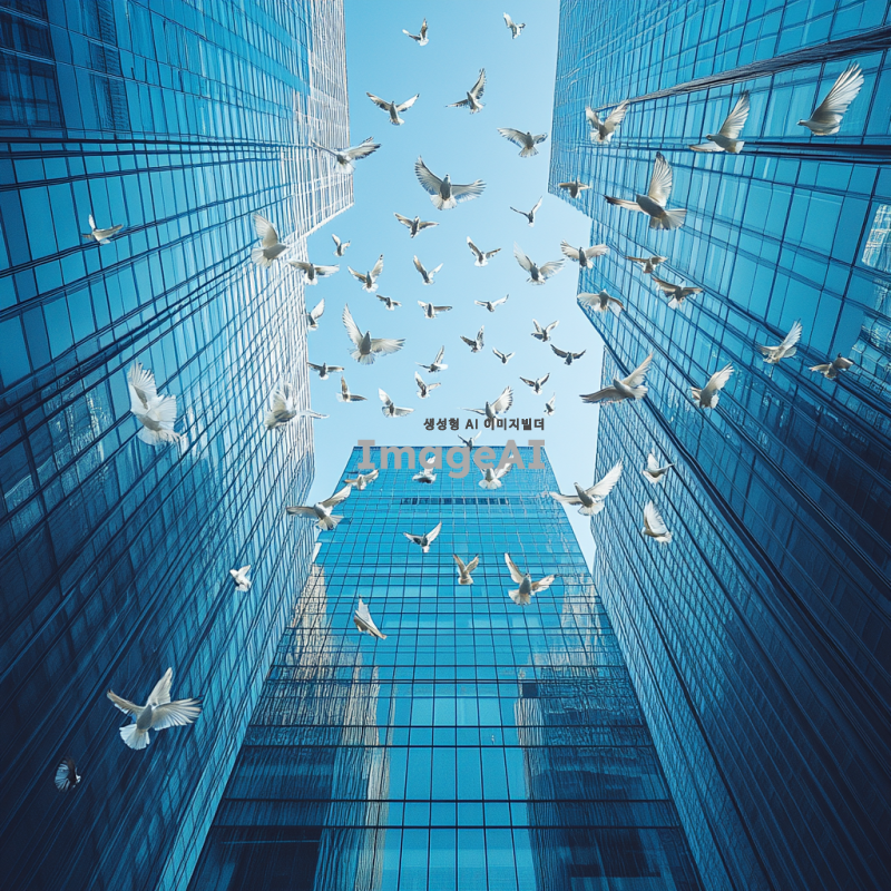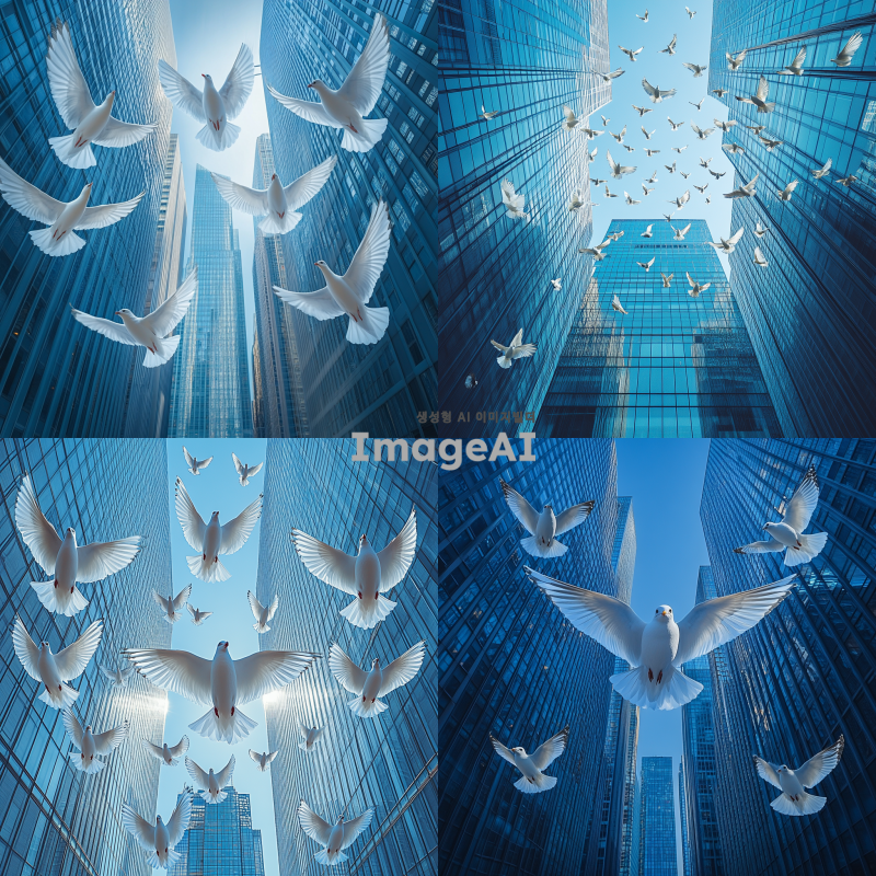 도시의 건물들 사이로 하늘을 나는 하얀 새들, 아래에서 위로 올려다본 시점, 현대적인 고층 건물들이 주변에 위치하고 있으며, 맑고 푸른 하늘 배경, 새들은 다양한 크기와 자세로 날아다니며 평화롭고 조화로운 분위기, 건물의 유리창에 반사된 새들의 모습, 자연과 도시의 조화로운 공존을 강조하는 장면.