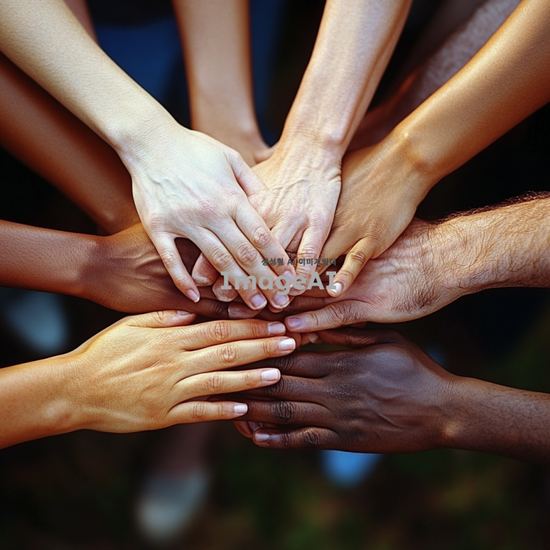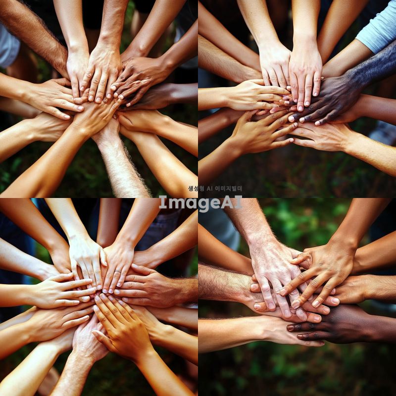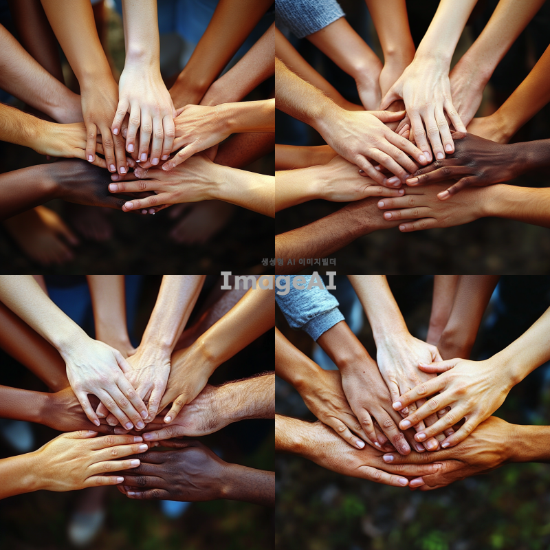 다양한 인종들이 손을 서로 대고 있다. 손만 보인다.