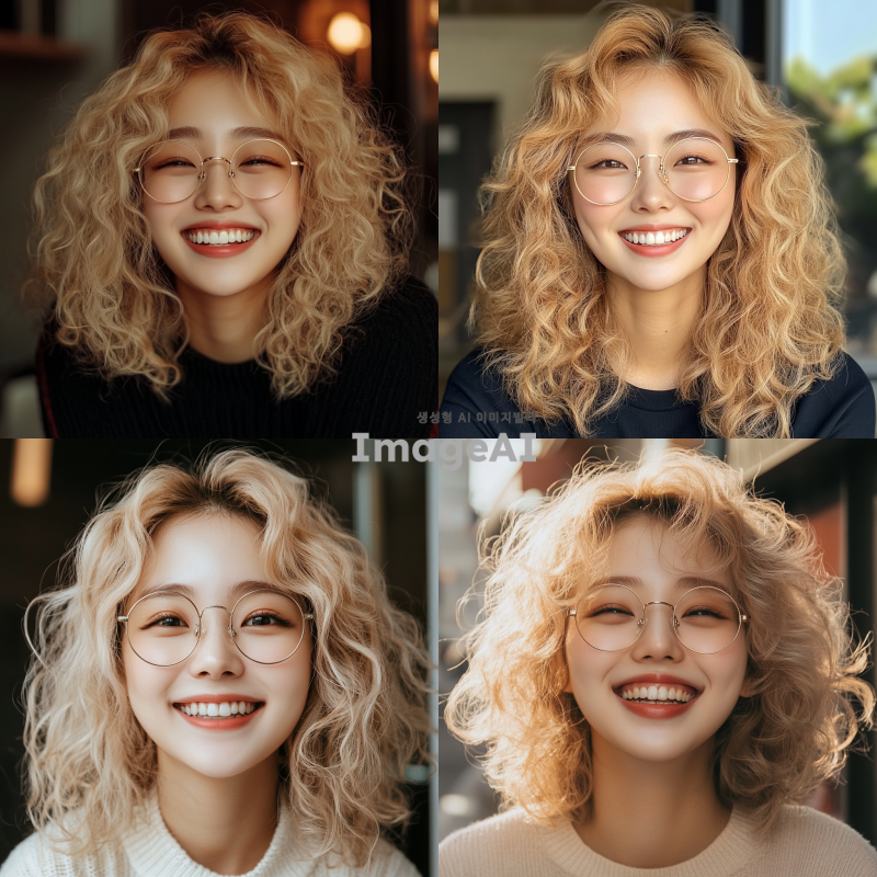 곱슬 금발 머리의 한국 여자가 환하게 웃고 있다. 동그란 안경을 쓰고 있다.