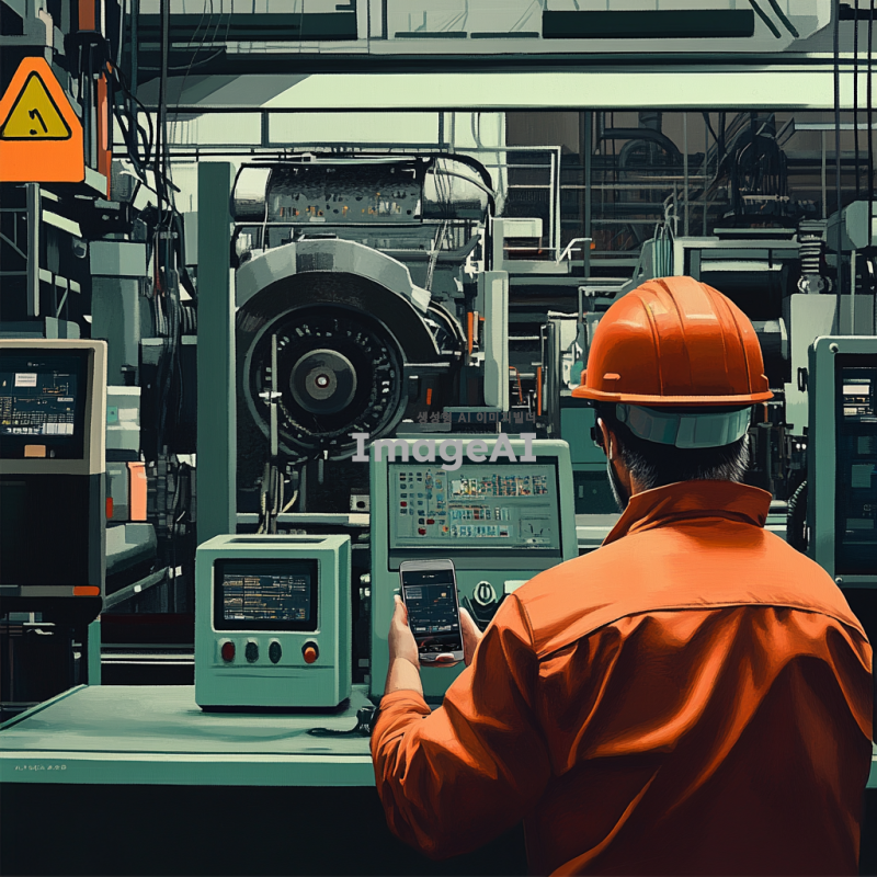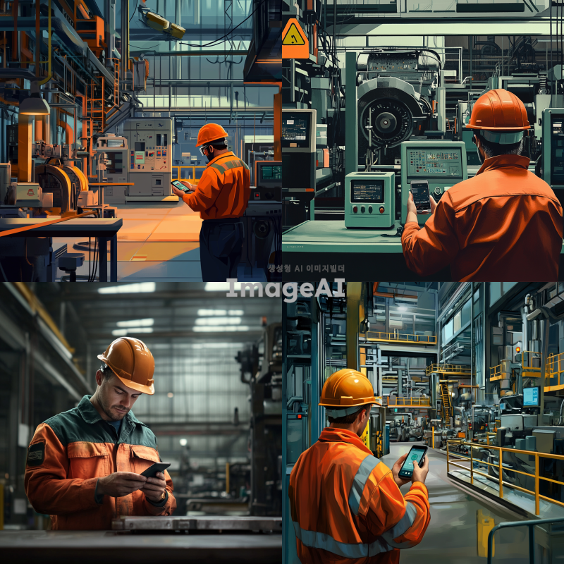 안전모를 착용한 근로자가 공장 내부에서 스마트폰을 사용하고 있는 장면, 주변에는 기계장치와 작업 도구들이 있으며, 스마트폰 사용으로 인해 주의가 분산된 상태를 강조, 작업 환경은 산업 현장의 느낌을 주며, 안전 표지판이 있는 배경, 자연스러운 조명과 현실적인 디테일.