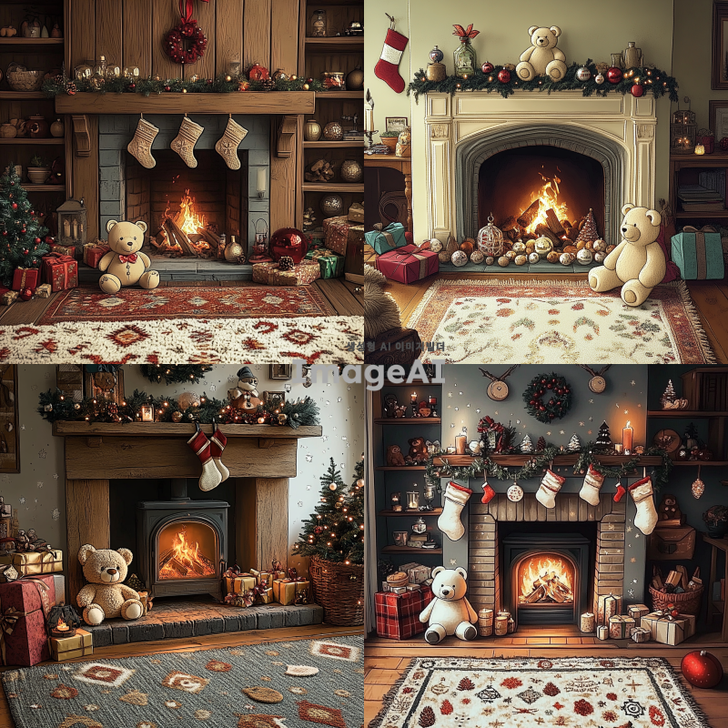 아늑한 크리스마스 스타일로 벽난로가 메인이고 의자는 없지만 카펫은 있고 벽난로 위에 곰돌이도 있고 난로 밑에 불이 아니라 아기자기한 소품들이 가득 있으면서 조잡하지 않았으면 좋겠어.