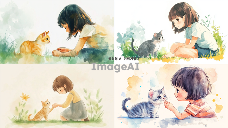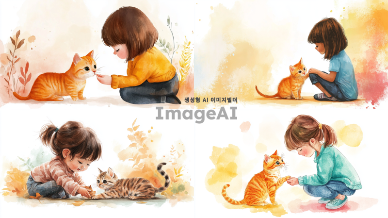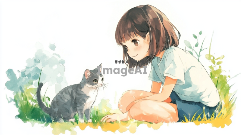 고양이와 노는 단발머리 소녀를 수채화 형식으로 그려붜
