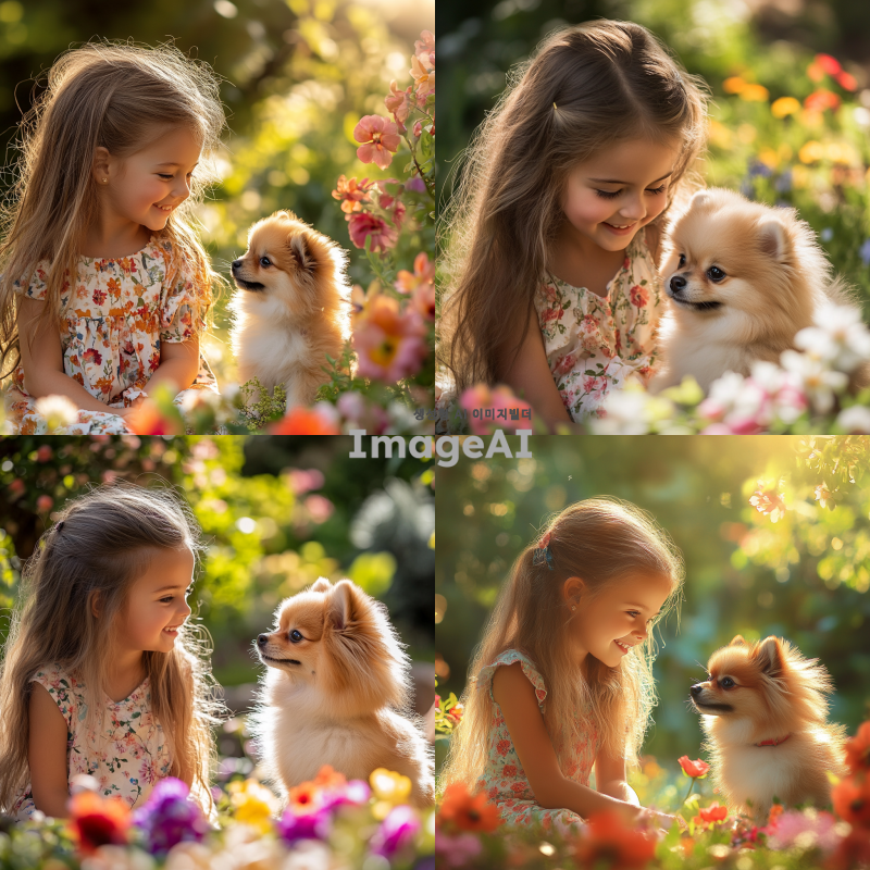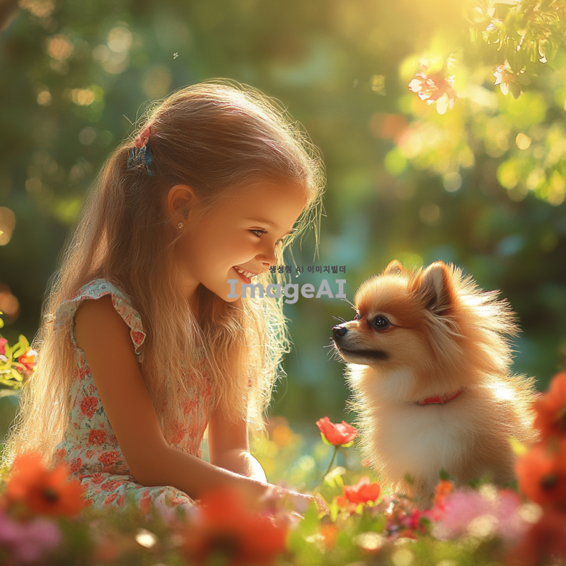 밝은 햇살이 비치는 공원에서 예쁜 여자 아이가 웃으며 예쁜 강아지를 바라보고 있는 장면. 아이는 긴 머리를 가진 7살 정도의 귀여운 소녀로, 꽃무늬 드레스를 입고 있다. 강아지는 작은 크기의 포메라니안으로, 털이 부드럽고 풍성하다. 주변에는 알록달록한 꽃들이 피어 있고, 따뜻한 분위기가 느껴지는 장면. 아이와 강아지의 눈빛이 서로를 향해 있으며, 행복하고 평화로운 느낌을 강조.