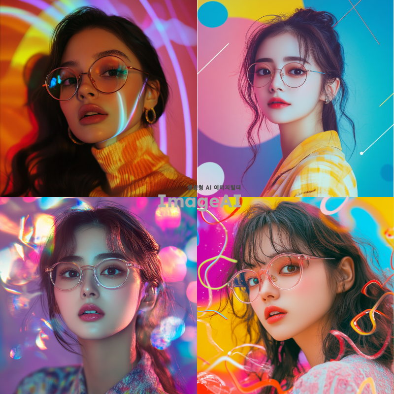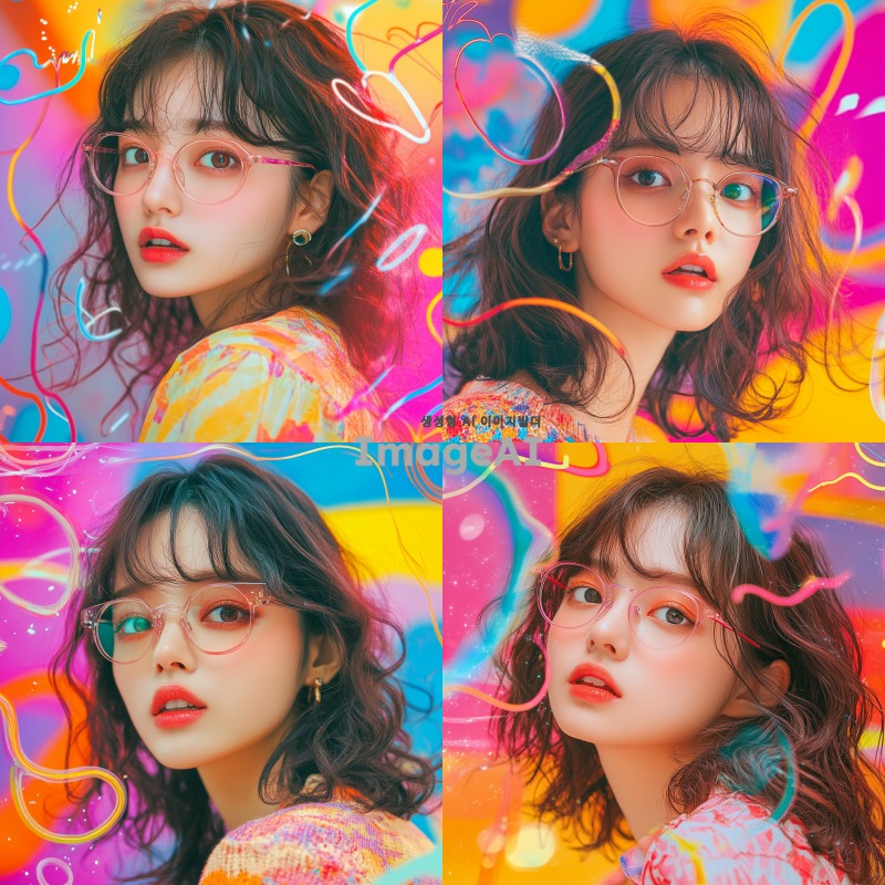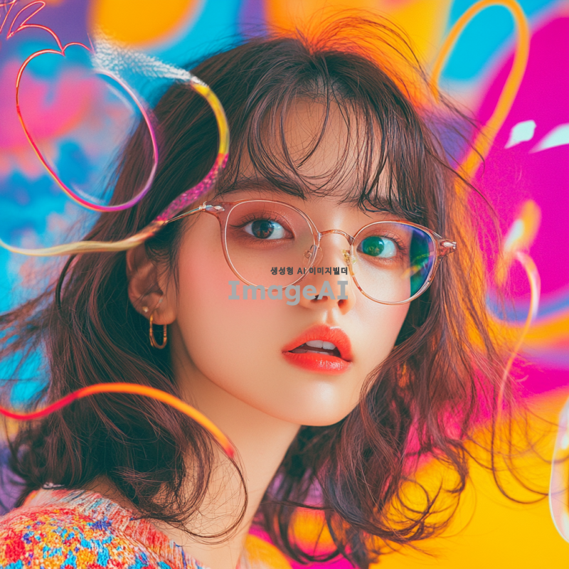 안경을 쓴 매력적인 연예인의 모습, 다양한 색감으로 가득 찬 화면, 귀엽고 매력적인 표정을 강조한 장면.