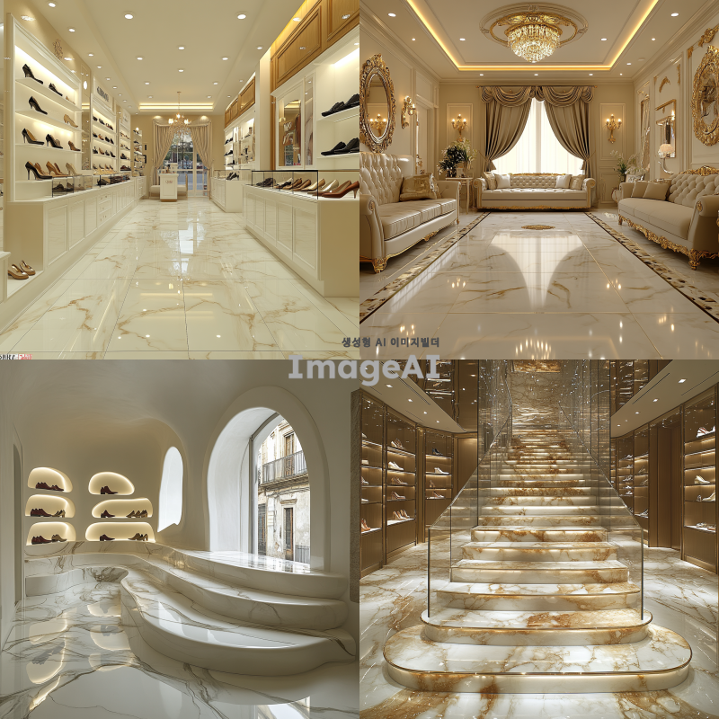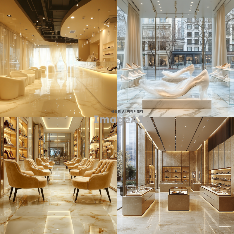 우아하고 세련된 분위기의 현대적인 패션 스튜디오, 부드러운 조명이 비치는 고급스러운 인테리어, 대리석 바닥과 우아한 실크 커튼, 신발을 돋보이게 하는 미니멀한 디스플레이, 배경에 은은하게 흐르는 클래식 음악의 느낌, 고급스러운 색조의 팔레트, 세련된 디자인 요소들이 조화를 이루는 장면.