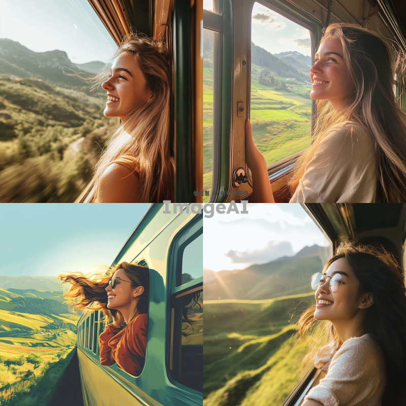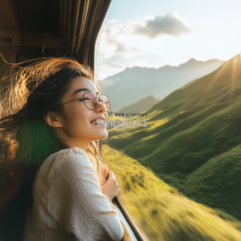 자연 속에서 기차 여행을 즐기는 여성, 창 밖으로 얼굴을 내밀고 미소 짓는 모습, 주변에는 푸르른 산과 맑은 하늘, 기차의 고풍스러운 디자인과 창문, 여성의 머리카락이 바람에 날리는 장면, 따뜻한 햇살이 얼굴을 비추는 분위기.