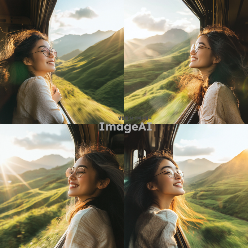자연속에서 멋진 기차 여행을 하는 여성이 창 밖으로 얼굴을 내밀고 사진을 찍는 모습을 만들고 싶어.