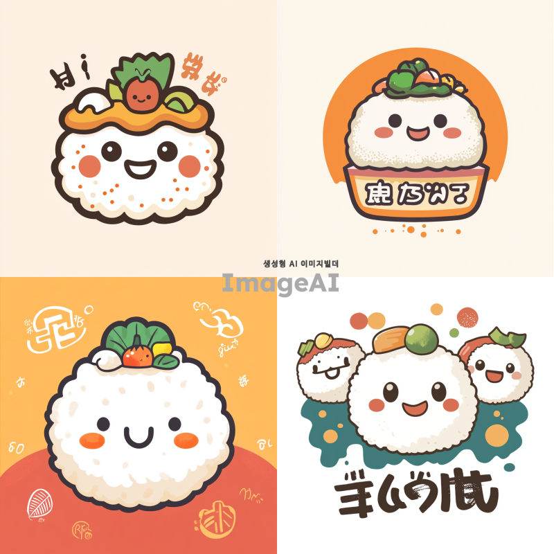 귀여운 주먹밥 캐릭터가 중심에 있는 로고 디자인, 밝고 친근한 색상 사용, 주먹밥 캐릭터는 웃는 얼굴로 행복한 표정, 주먹밥 위에 작은 야채나 김 장식, 부드러운 곡선과 동글동글한 형태, 아기자기한 분위기의 배경, 손글씨 스타일의 가게 이름 텍스트, 전체적으로 따뜻하고 포근한 느낌 강조