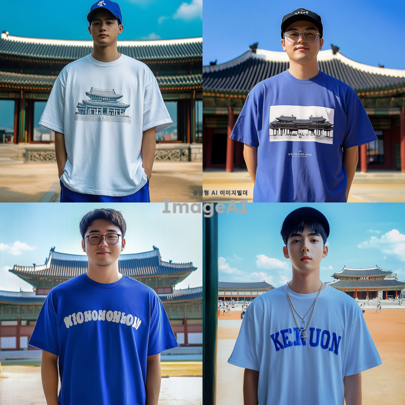 이 티셔츠를 입고 있는 한국 아이돌을 닮은 남자가 경복궁 앞에 서 있는 모습