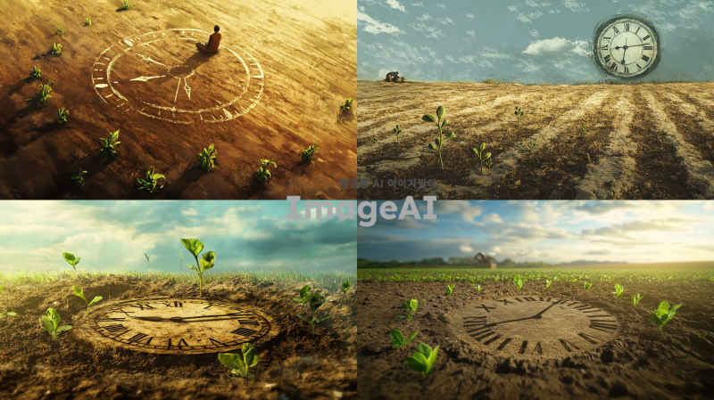 농사를 지은 후 휴식 중인 들판, 땅 위에는 시계가 그려져 있으며, 시계의 바늘이 천천히 움직이는 모습, 들판 주변에는 자라나고 있는 작은 새싹들과 휴식을 취하는 농부의 모습, 조금은 여유롭지 않은 모습 , 시간의 흐름을 상징하는 부드러운 바람이 불고 있는 장면.