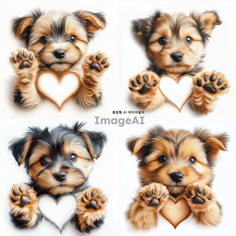 강아지가 양손가락으로 하트를 그리는 모습, 강아지의 발바닥이 보이고, 하트 모양은 털로 연출된 장면, 귀엽고 사랑스러운 분위기, 부드러운 조명, 따뜻한 색감, 세밀한 털의 질감, 강아지의 밝고 생동감 있는 표정, 백색 배경.