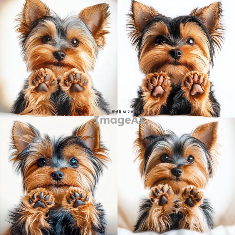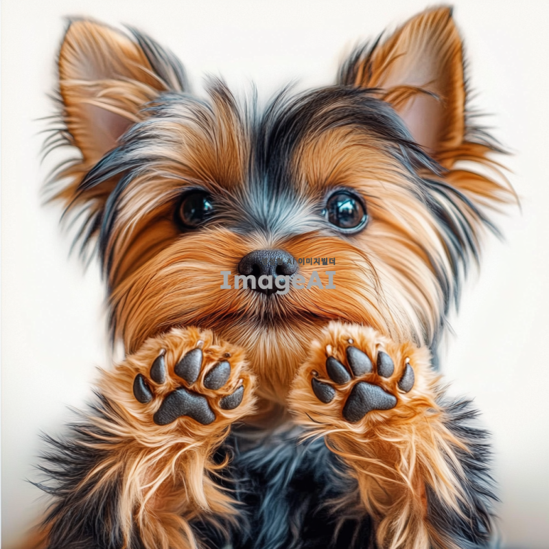 요크셔테리어가 양손가락으로 하트를 만들고 있는 모습, 발바닥이 보이는 장면, 귀엽고 사랑스러운 분위기, 밝고 따뜻한 색감, 부드러운 배경, 강아지의 털이 부드럽고 윤기나는 질감, 흰색배경, 자연스럽고 포근한 느낌.
