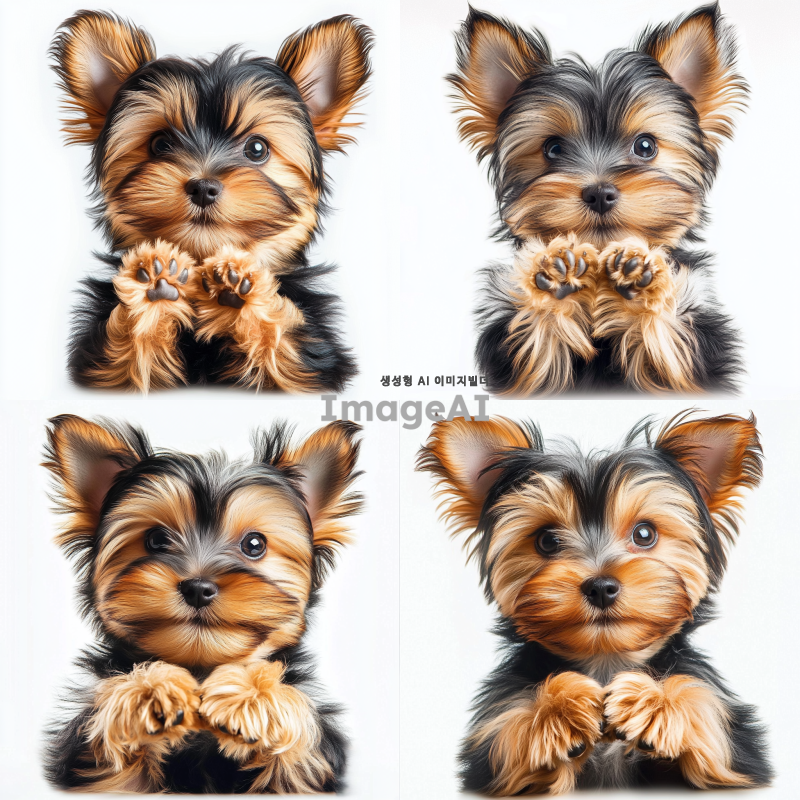 귀여운 요크셔테리어가 앞발로 하트 모양을 만들고 있는 모습, 부드럽고 따뜻한 조명, 밝고 화사한 배경, 강아지의 털은 윤기 있고 잘 정돈된 상태, 사랑스러운 표정과 반짝이는 눈을 강조, 배경은 백색.