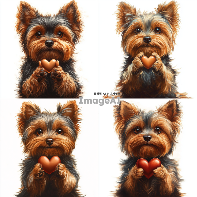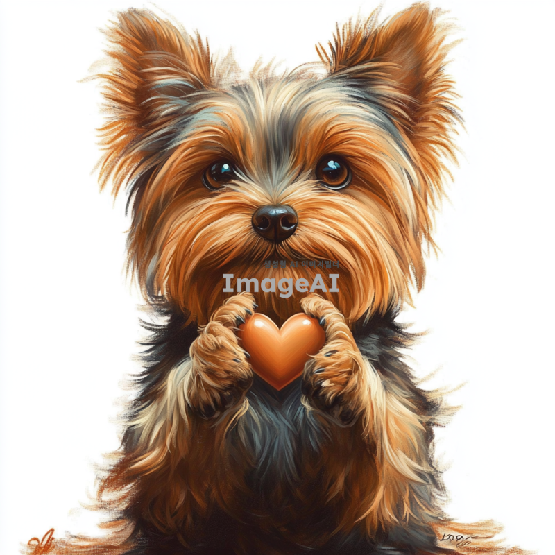 털이 잘 정돈된 요크셔테리어, 두 손가락으로 하트를 그리며, 호기심 어린 눈, 부드러운 조명, 따뜻한 분위기, 디테일한 털의 질감, 귀여운 표정, 생동감 있는 포즈, 밝고 선명한 색감.