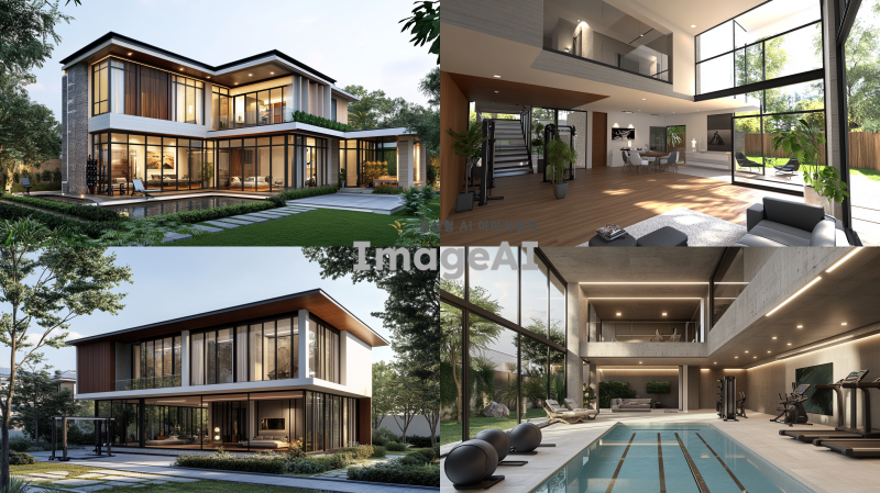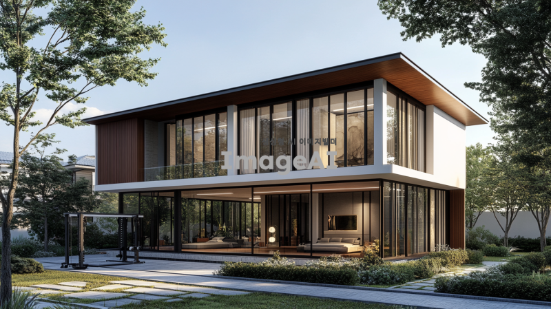 현대적인 2층 단독 주택, 격투기 선수를 위한 디자인, 넓은 훈련 공간과 체육관 장비가 있는 1층, 편안한 휴식 공간과 자연 채광이 잘 드는 거실, 2층에 위치한 휴식용 침실과 개인 서재, 외부에 있는 작은 정원과 야외 운동 공간, 모던하고 실용적인 인테리어, 격투기와 운동을 반영한 장식 요소, 기능성과 편안함을 동시에 고려한 공간 배치.
