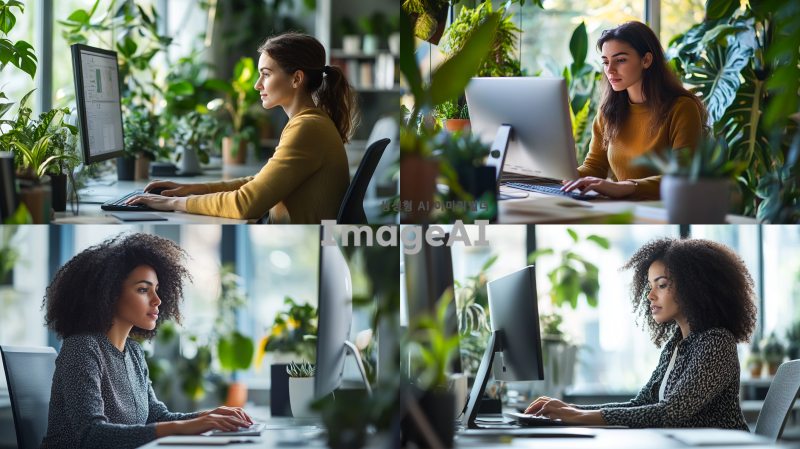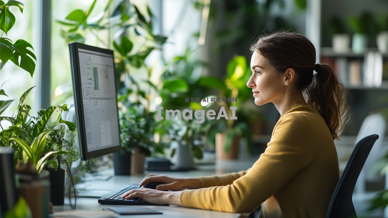 20대 여성이 사무실에서 컴퓨터로 일하는 장면, 현대적이고 세련된 오피스 환경, 깔끔한 책상과 모니터, 집중하고 있는 표정, 전문적이고 활기찬 분위기, 자연광이 들어오는 창문, 실내 식물 배치, 캐주얼 복장