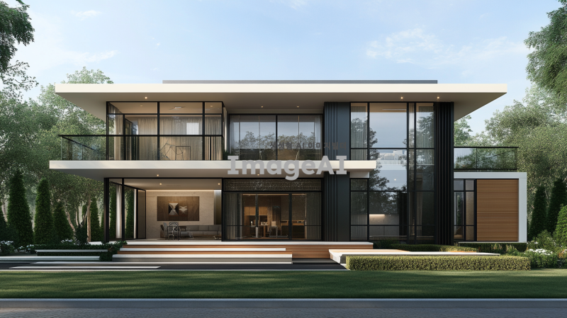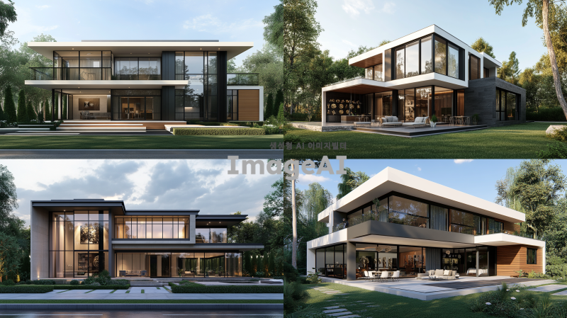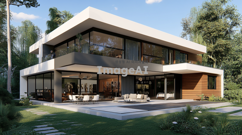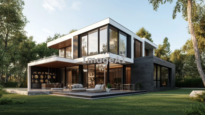 현대적이고 세련된 2층 단독주택, 격투기 선수를 위한 공간, 1층 넓은 거실과 주방, 적당한 인테리어, 외관은 강인함을 나타내는 디자인, 자연광이 풍부하게 들어오는 큰 창문, 실내에는 트로피와 메달을 전시할 수 있는 공간, 맞춤형 주방과 편안한 휴식 공간,2층에는 넓은 운동시설 스파링매트, 1층공간과 2층공간에 분리