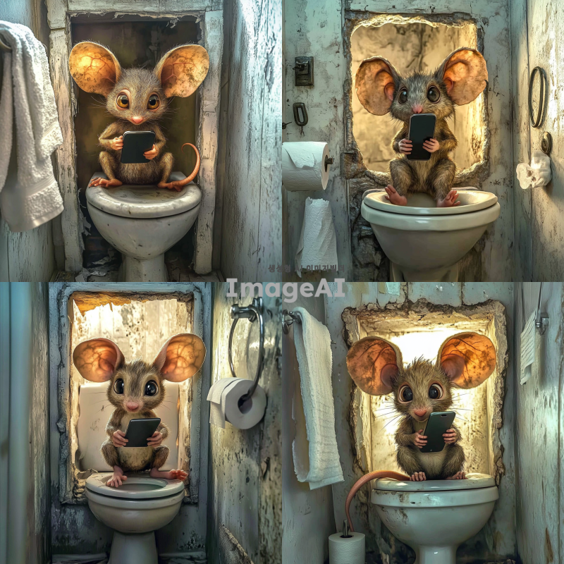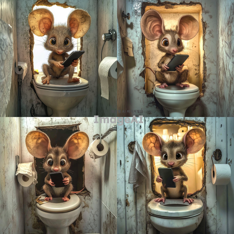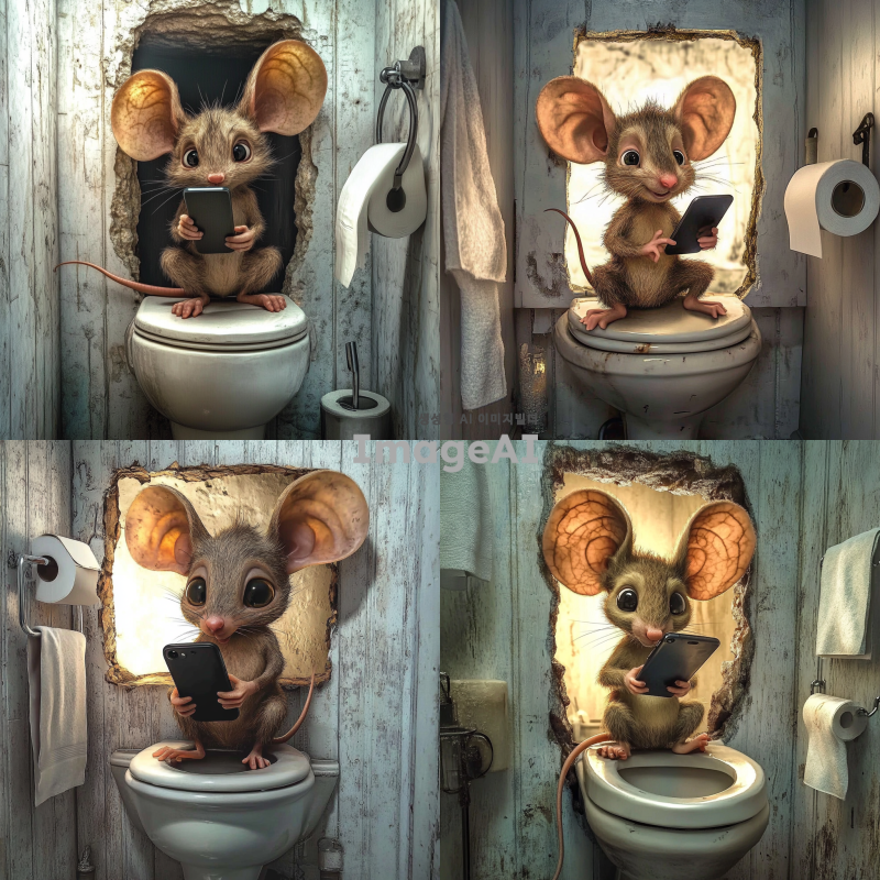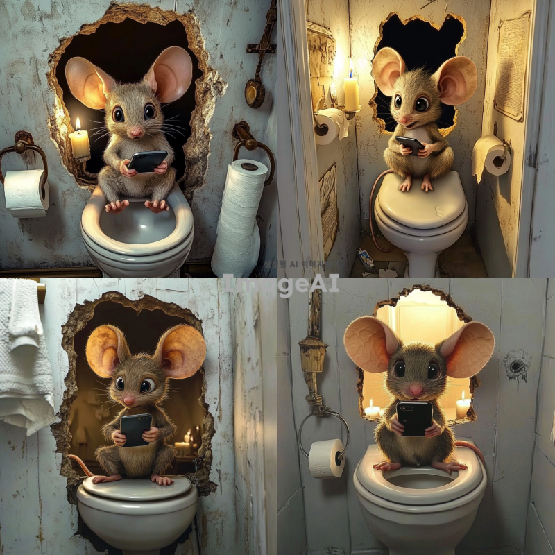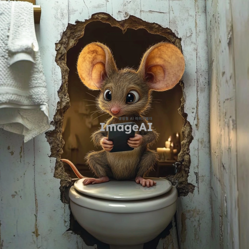 귀여운 큰 귀를 가진 생쥐가 벽이 뚫린 구멍난 벽 안쪽에 위치한 화장실 좌변기에 앉아 있는 장면, 생쥐는 스마트폰을 손에 들고 있으며, 화장실에는 은은한 촛불이 켜져 있는 모습, 벽에는 화장지와 수건이 걸려 있는 디테일, 생쥐는 귀여운 큰 눈을 하고 있는 표정.