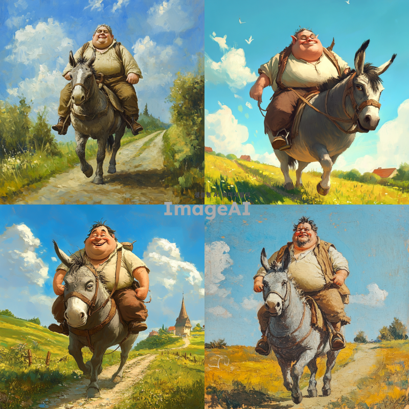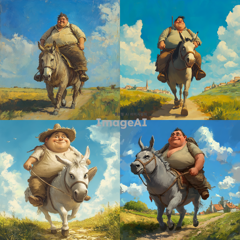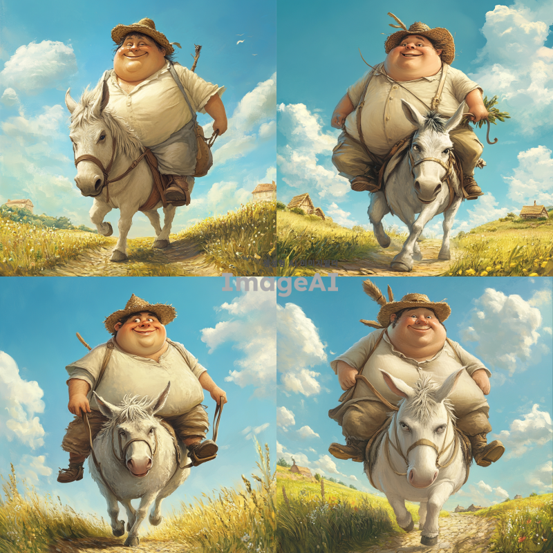 뚱뚱하고 순진한 표정의 남자가 당나귀를 타고 있는 장면, 푸른 하늘과 초원이 펼쳐진 배경, 남자는 헐렁한 옷을 입고 있으며 당나귀는 느긋하게 걷고 있음, 전체적으로 유머러스하고 평화로운 분위기.