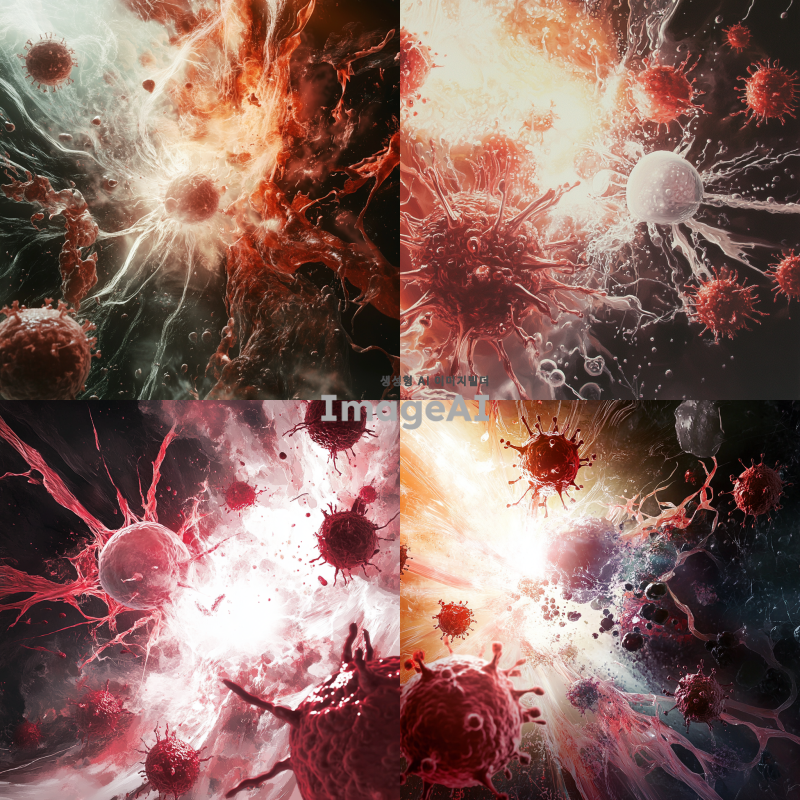 NK세포가 중앙에서 강력하고 역동적인 포즈로 암세포와 바이러스 세포를 공격하는 장면. NK세포는 흰색계열로 밝고 활기찬 에너지를 발산하며, 세포의 세부구조가 명확하게 보임. 암세포와 바이러스 세포는 붉은색조로 위협적인 분위기를 나타내며 주변에서 공격받는 모습. 생물학적 정확성을 유지하며, NK세포의 힘을 강조하기 위해 빛나는 효과 추가. 전체적인 색조는 대조적이며, NK세포의 활력을 더욱 부각.