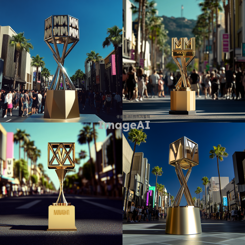 할리우드 메인 스트릿에 위치한 MAMA AWARDS 트로피, 주변에는 할리우드의 상징적인 건물들과 야자수가 늘어서 있는 거리, 낮 시간대의 밝고 화사한 분위기, 사람들의 활기찬 움직임과 함께 트로피가 중심에 놓인 모습, 트로피는 빛을 받아 반짝이며 주목을 받는 장면, 거리의 활기와 문화적 융합을 느낄 수 있는 장면.