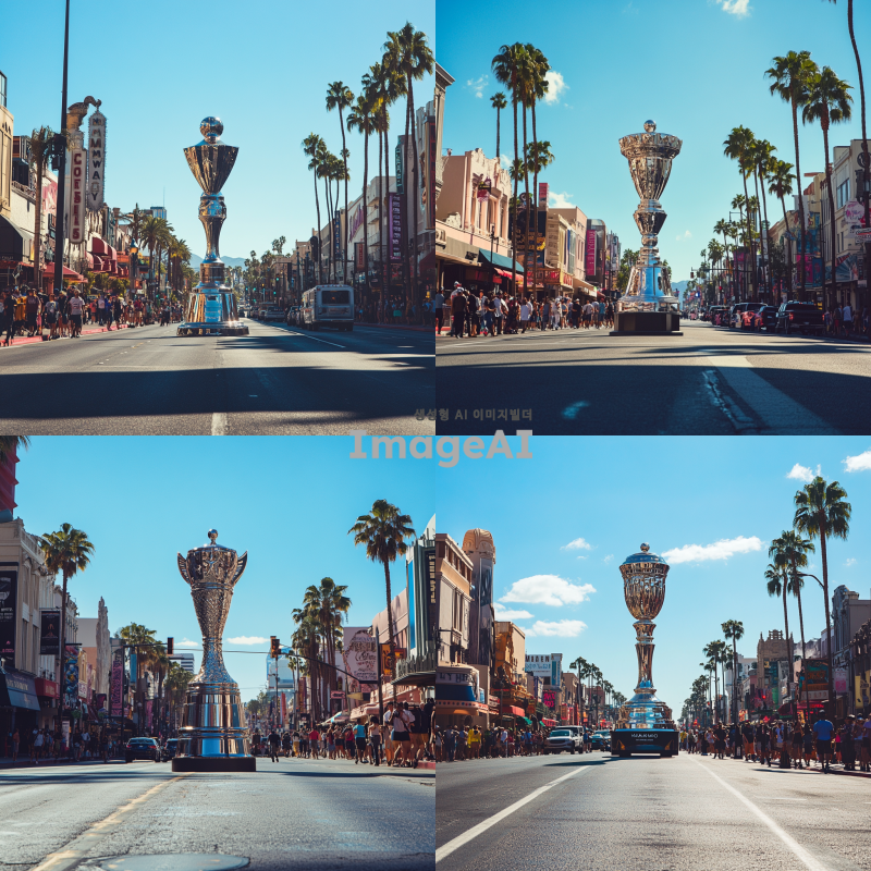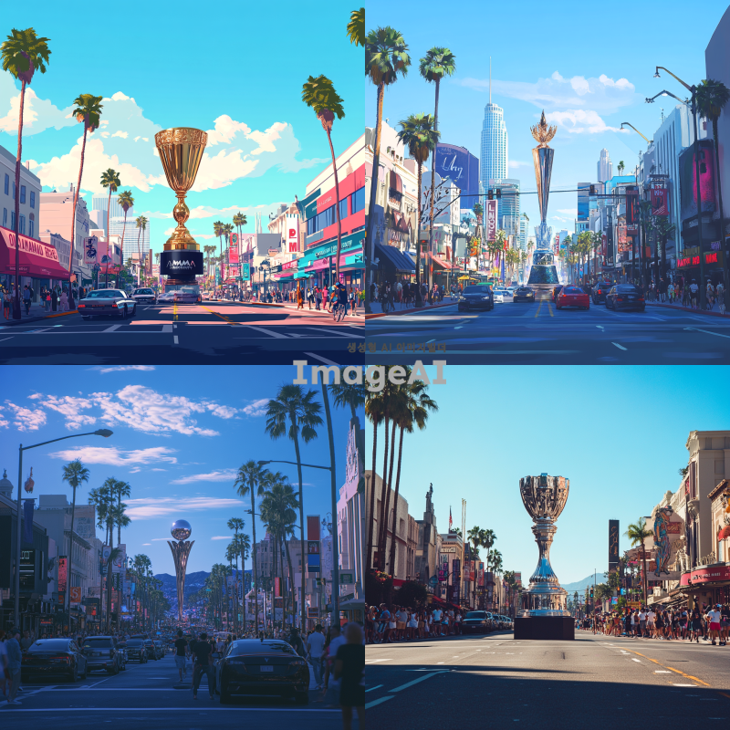 거대한 MAMA AWARDS 트로피가 LA 할리우드 메인 스트릿 한가운데 우뚝 서 있는 장면, 주변에는 할리우드의 상징적인 건물들과 야자수가 늘어서 있으며, 하늘은 맑고 푸른 색조로 표현되어 있음. 트로피는 빛을 반사하며 화려하고 웅장한 느낌을 주고, 거리에는 사람들과 차량들이 움직이며 활기찬 분위기를 더함 (FOOH 형태)