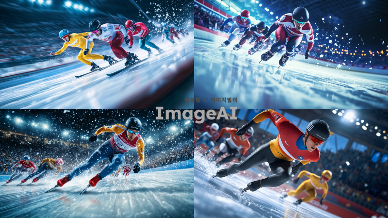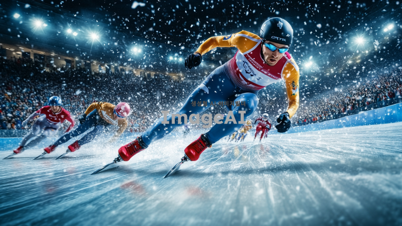 빙판 위에서 역동적으로 질주하는 쇼트트랙 선수들, 빠른 속도감과 긴장감이 느껴지는 장면, 선수들의 집중된 표정과 강렬한 에너지가 강조된 이미지, 다양한 국가의 선수들이 각자의 팀복을 입고 경쟁하는 모습, 얼음 조각이 튀어오르는 생동감 있는 표현, 경기장의 조명과 관중석의 분위기가 어우러진 장면.