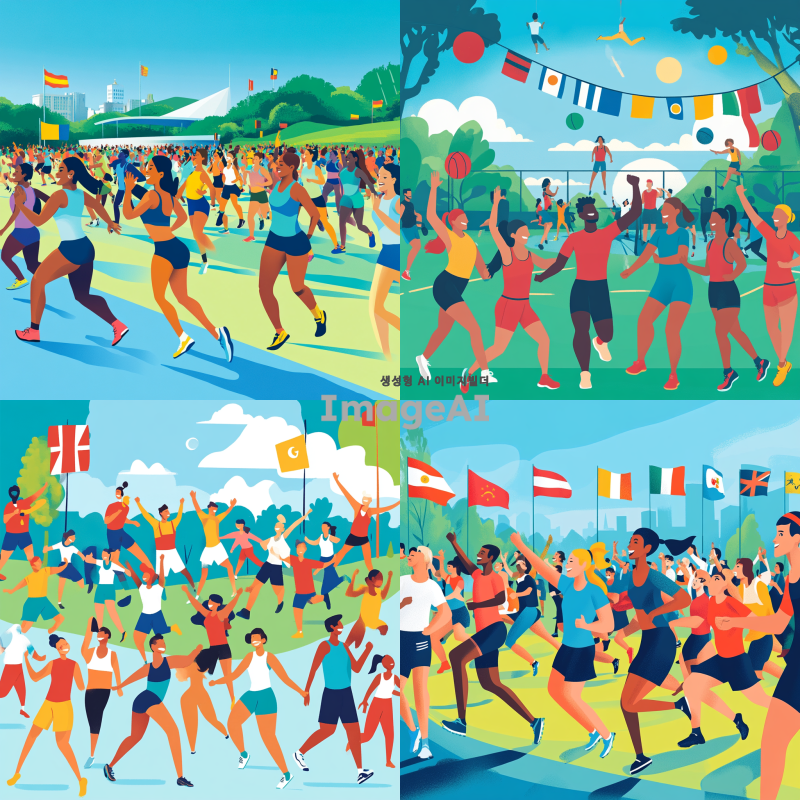 글로벌 네트워크로 연결된 생활체육인들의 역동적인 모임, 다양한 국적의 사람들이 함께 운동을 즐기며 활기찬 분위기, 현대적이고 세련된 운동복을 입은 참가자들, 다양한 스포츠 장비와 함께하는 장면, 푸른 하늘 아래 넓은 공원이나 현대적인 체육관 배경, 웃고 있는 얼굴들, 서로 하이파이브를 하거나 대화하는 모습, 다채로운 국기의 색상이 포함된 이미지.