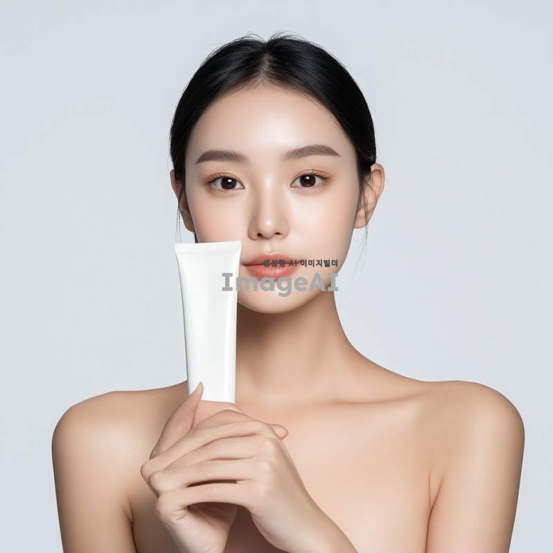 아름다운 아시아 여성 모델이 밝고 환한 조명 아래에서 카메라를 정면으로 응시하며 제품을 들고 있는 모습, 모델의 상반신만 나타나며 제품 크기는 가로 15cm, 세로 20cm로 얼굴을 가리지 않도록 위치, 그늘이 지지 않는 깔끔한 배경.
