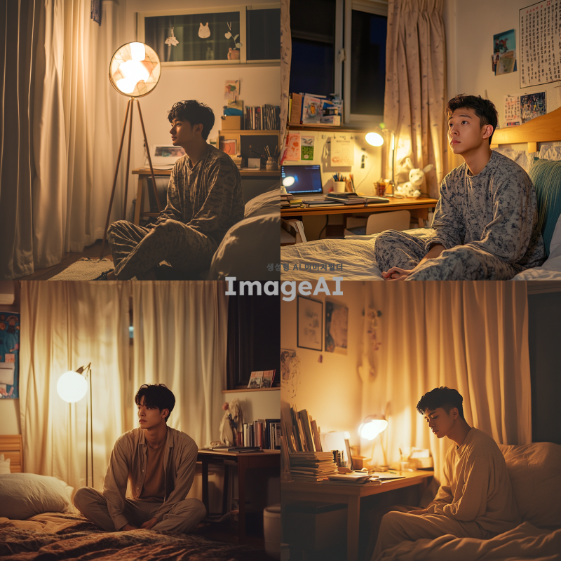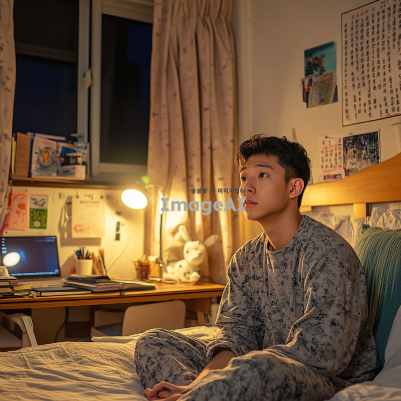 20대 동양인 남성이 침대 옆에 앉아 천장을 향한 스탠드 조명을 켜는 모습, 방 안은 아늑하고 따뜻한 분위기, 남성은 편안한 잠옷을 입고 있으며, 방 안에는 책상과 책들이 정돈되어 있음, 벽에는 간단한 장식이 걸려 있고 창문에는 커튼이 드리워져 있음, 전체적으로 평화롭고 조용한 밤의 느낌.