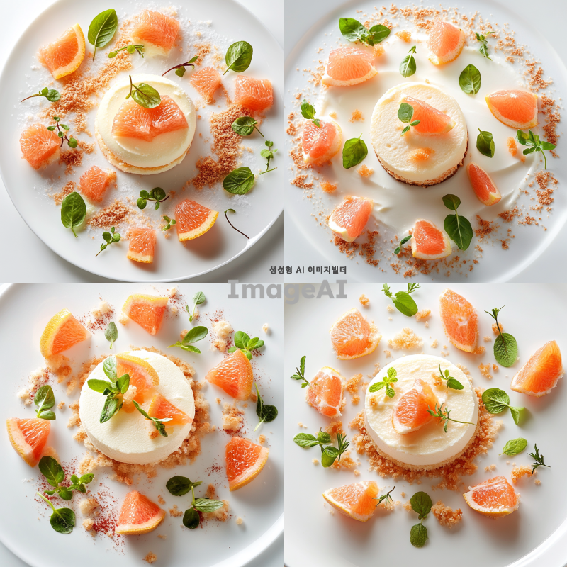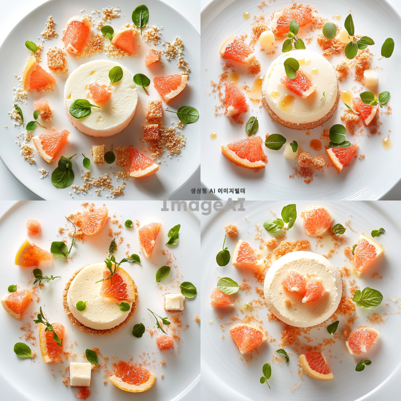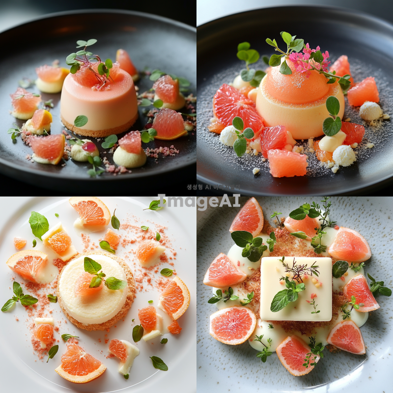 자몽무스케이크가 접시 중앙에 놓여 있는 디저트 플레이팅. 자몽무스케이크 주변에는 작게 자른 코하쿠토, 신선한 자몽 과육, 허브 잎, 마이크로 소프트 케이크 조각들이 조화롭게 배치되어 있음. 전체적으로 깔끔하고 세련된 디자인으로, 각 요소들이 서로 어우러지며 시각적으로도 맛있어 보이는 느낌을 주는 플레이팅.