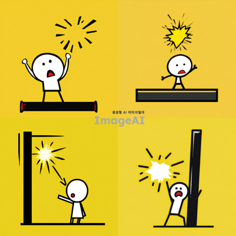 검은색 철근에 머리를 부딪히는 졸라맨, 충돌 지점은 노란색으로 강조, 배경은 노란색, 단순하고 명확한 스타일, 충격의 순간을 생생하게 표현, 졸라맨의 표정은 놀람과 통증을 나타냄. 이미지를 참고해서 하되 삼각형 테두리는 빼고 그려줘