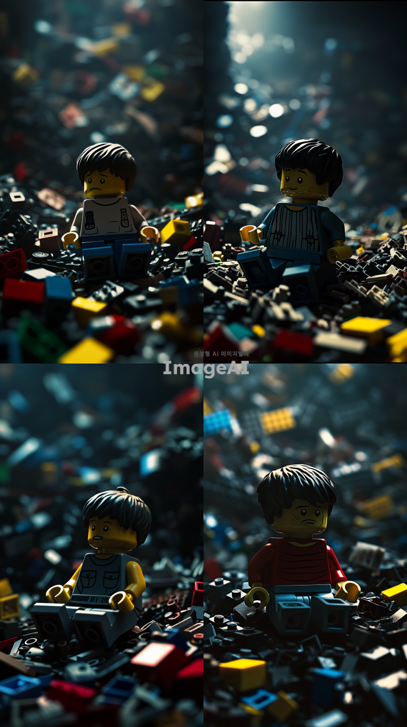어두운 장면 속 쓰레기더미에 앉아 있는 버려진 아이 레고, 울고 있는 표정, 전체적으로 어두운 분위기, 슬픔이 느껴지는 장면, 레고 특유의 블록 질감과 디테일을 강조