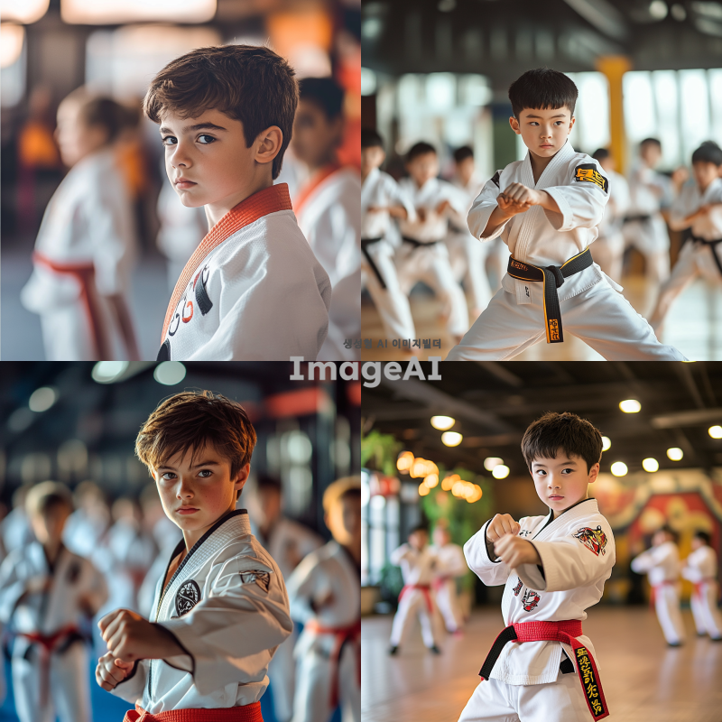 밝고 활기찬 태권도장에서 태권도복을 입고 진지하게 운동하는 남자 어린아이, 집중하며 발차기를 연습하는 모습, 주변에는 태권도 도복을 입은 다른 아이들이 함께 훈련하는 장면, 태권도 도장의 전통적인 분위기와 밝은 조명, 아이의 얼굴은 자신감과 열정으로 가득 차 있음.