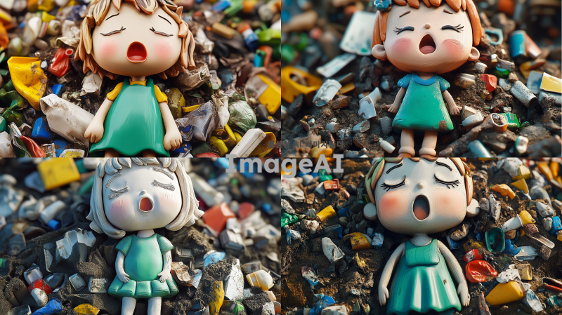 클레이로 만들어진 유치원생이 쓰레기더미 위에 올려져 있는 모습을 만들어줘. 표정은 우는 표정이였으면 좋겠고 캐릭터화 시켜서 만들어줘.