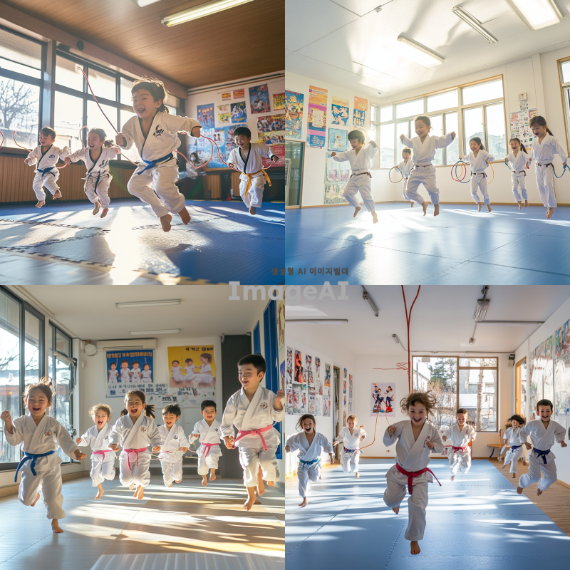 밝은 태권도 도장에서 다양한 연령대의 아이들이 줄넘기를 하고 있는 장면, 아이들은 태권도 도복을 입고 활기차고 즐거운 표정을 짓고 있으며, 도장의 벽에는 태권도 관련 포스터가 걸려 있고, 바닥은 깨끗한 매트로 덮여 있음, 창문으로 햇빛이 들어와 밝고 생동감 있는 분위기를 연출함.