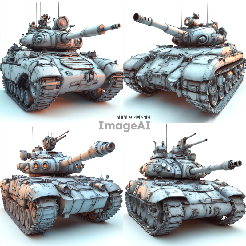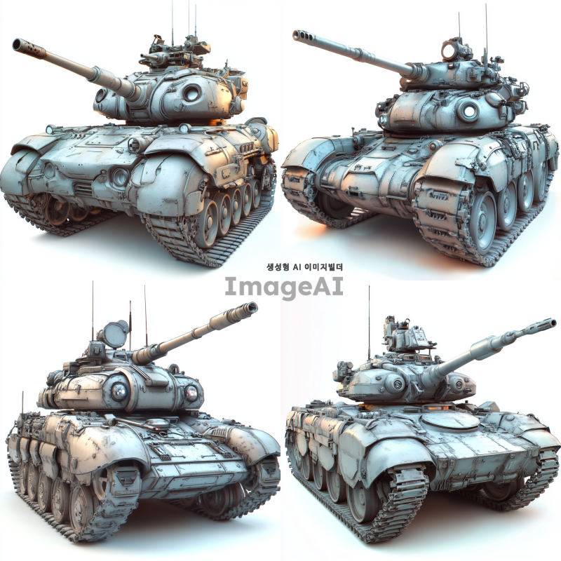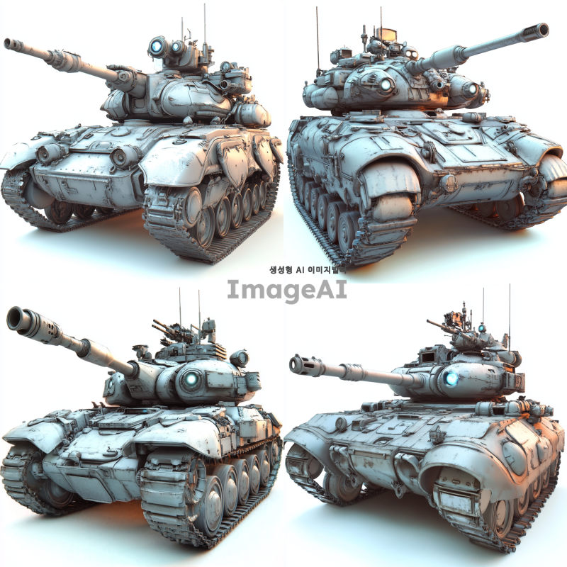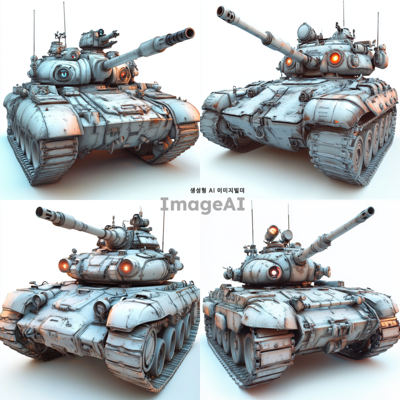 미래적인 탱크, 눈과 입이 있는 스스로 생각하고 움직이는 모습, 포신 외에 발칸포, 대포, 레이저 발사 장치 포함, 첨단 기술과 진화된 디자인, 강력하고 유연한 궤도 시스템, 현대의 탱크보다 훨씬 진화된 형태, SF 스타일, 디테일하고 혁신적인 외관, 전투용 로봇 같은 느낌, 고급스러운 메탈릭 색상과 텍스처.