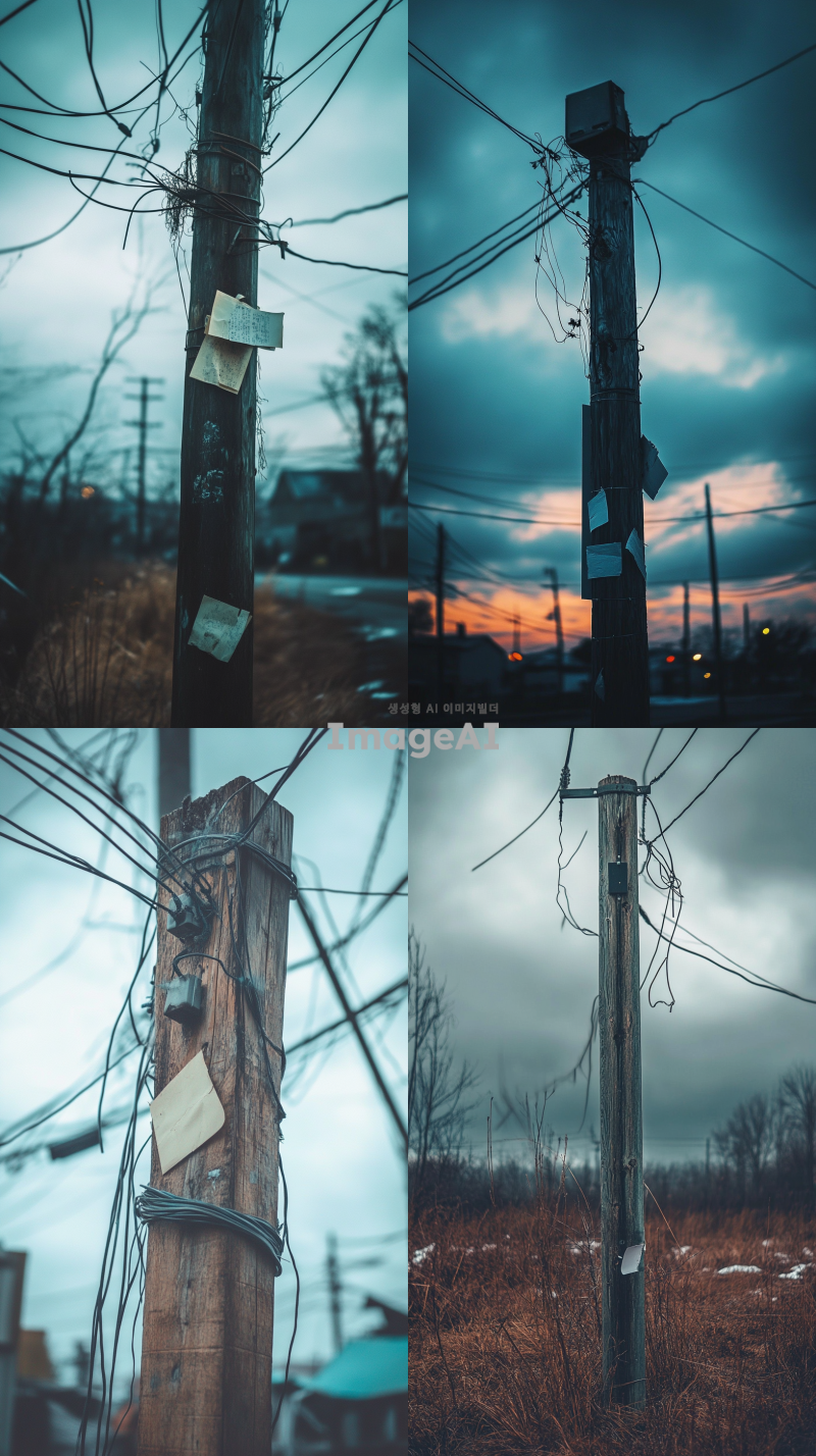 흐린 하늘 아래 차가운 분위기를 자아내는 오래된 전봇대, 주변에는 떨어져있는 한 두장의 종이와 흐릿한 배경, 전봇대에 얽힌 전선들이 바람에 흔들리는 모습, 차가운 색조의 조명과 어울리는 분위기.
