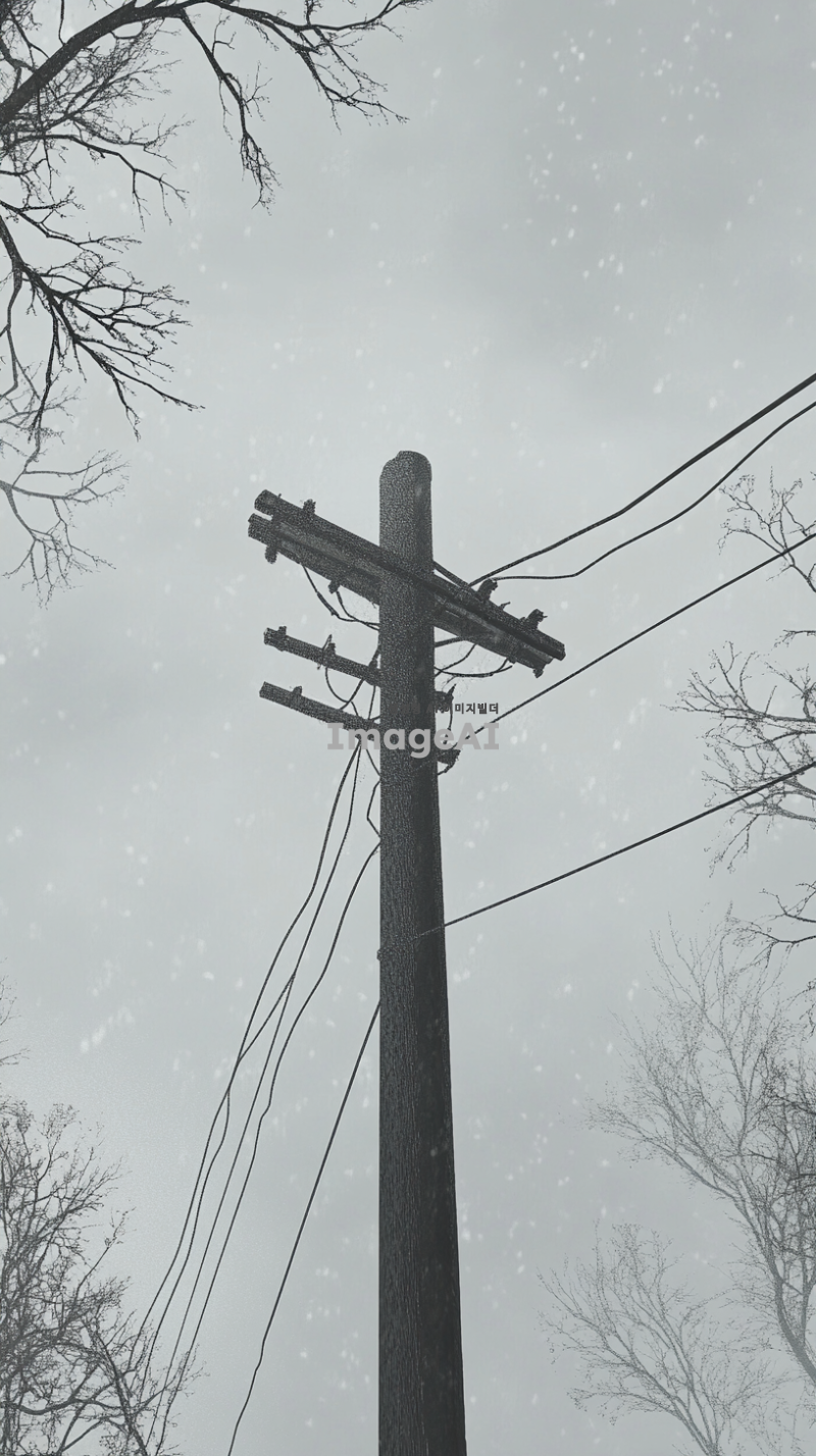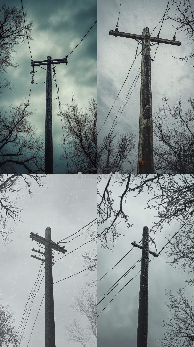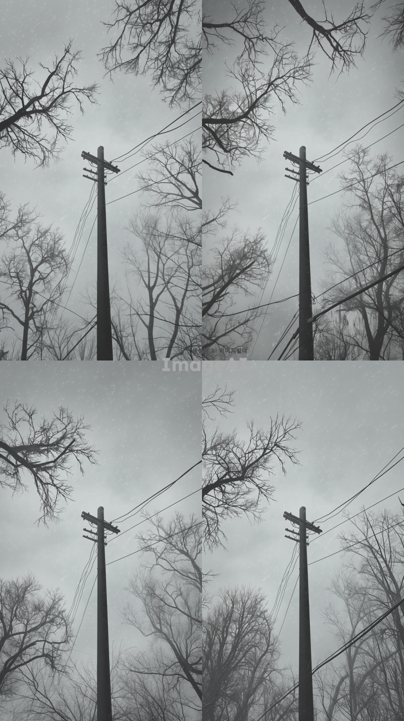 싸늘한 하늘 아래, 화면 중앙에 우뚝 서 있는 전봇대, 흐린 회색 구름이 드리운 하늘, 전봇대의 세부 구조가 잘 드러나도록 강조, 주변에 약간의 바람에 흔들리는 나뭇가지들이 배경에 어우러짐, 차가운 색조의 전체적인 분위기, 전봇대의 질감과 세부적인 디테일이 돋보이게끔 표현.