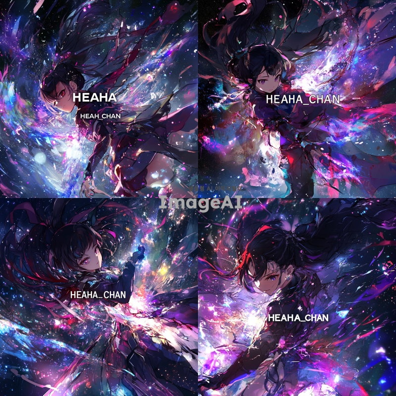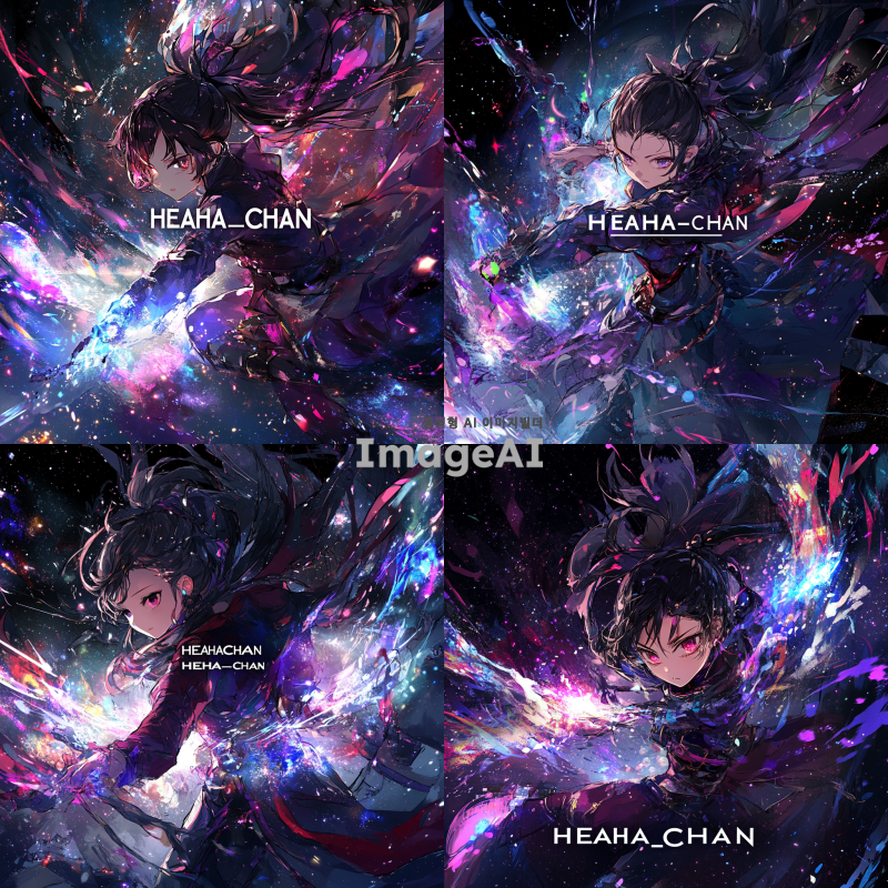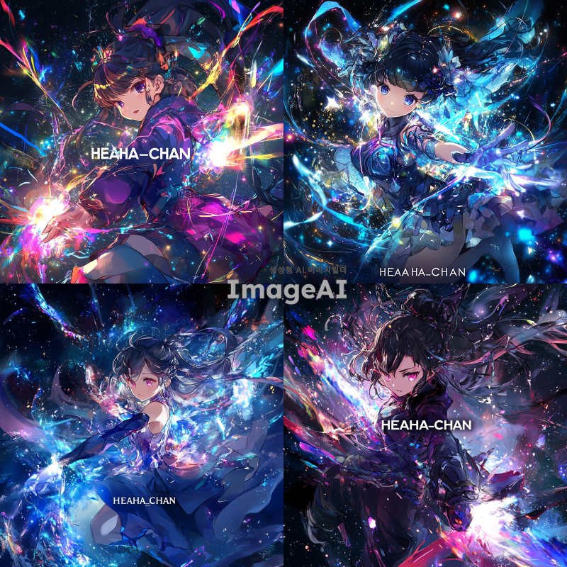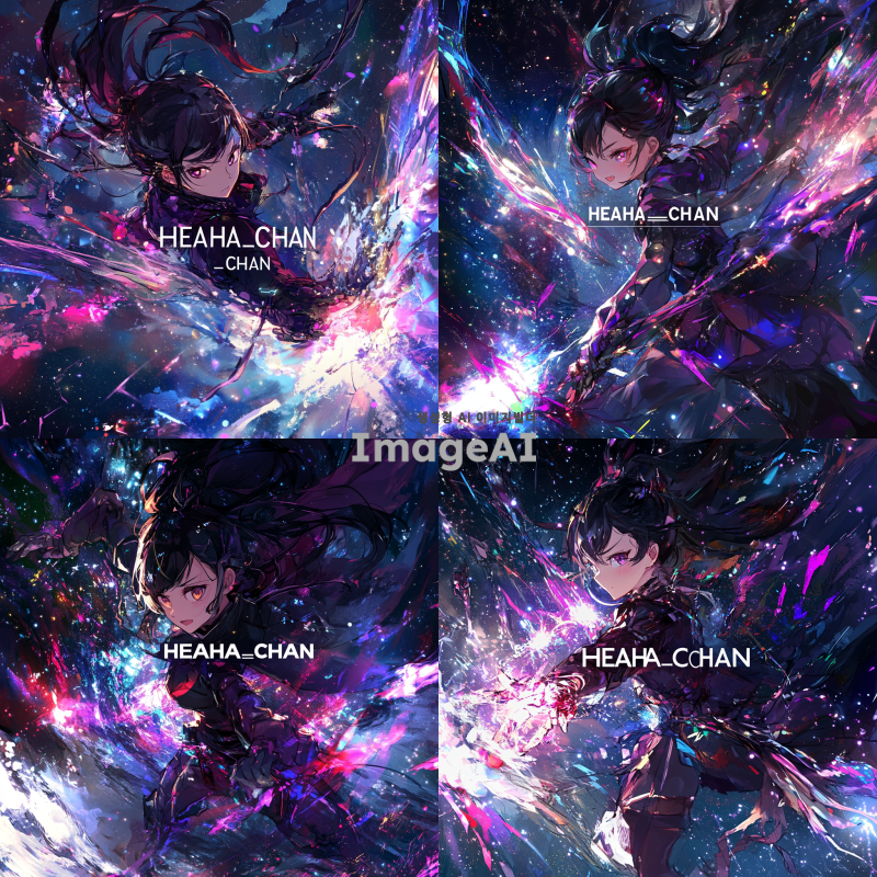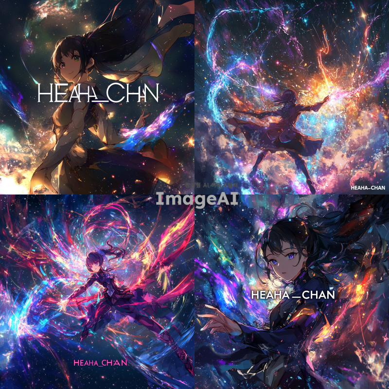 우주를 배경으로 한 여성 캐릭터가 마법을 사용하는 역동적인 전투 장면, 화려한 마법 효과와 빛나는 별들이 어우러진 신비로운 분위기, 중앙에 "HEAHA_CHAN"이라는 글자가 크게 배치된 이미지, 캐릭터는 미래지향적인 마법사 복장을 하고 있으며, 주변에는 다양한 색상의 에너지 파동과 별빛이 반짝임.
