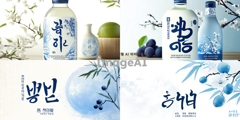 전통적인 한국의 미를 담은 소주 라벨 디자인, 푸른색과 흰색의 조화를 이루며, 은은한 대나무와 매화꽃의 패턴이 배경에 깔려 있고, 중앙에는 고급스러운 서체로 '소주'라는 글자가 쓰여 있으며, 자연의 순수함과 청량함을 표현하는 이미지.