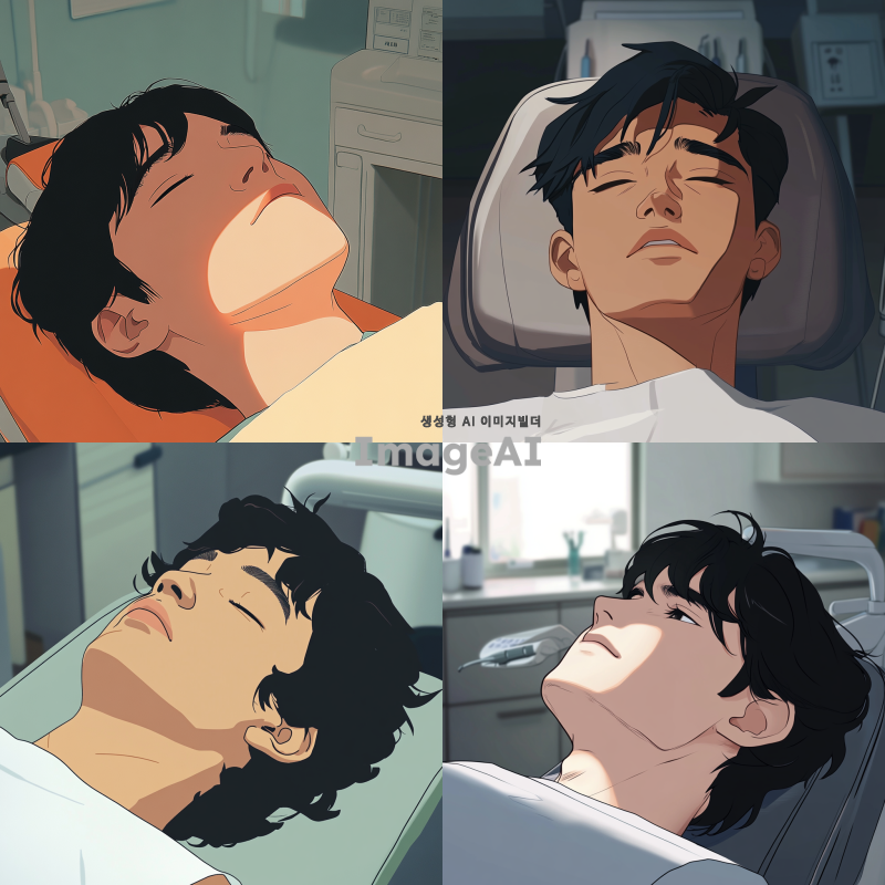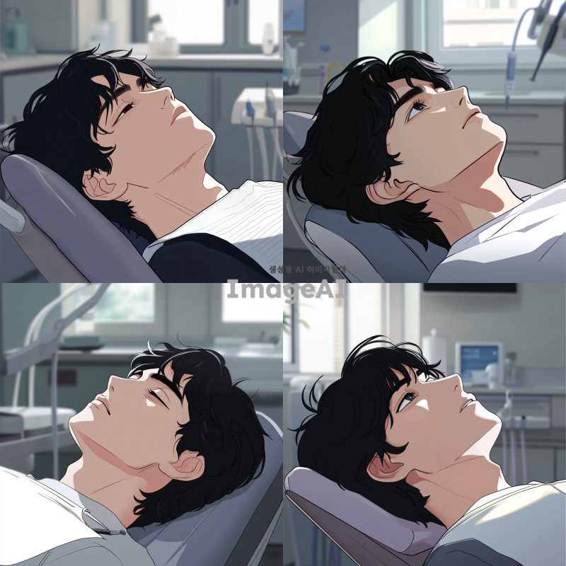 2D 스타일의 이미지, 치과 의자에 누워있는 남자, 검은색 머리카락, 무표정한 얼굴, 얼굴 확대, 치과 환경 배경, 차분한 색조