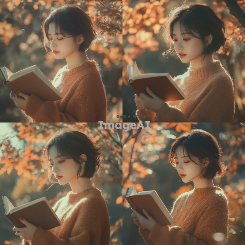 20대 후반 단발머리 여성, 쌍꺼풀 있는 눈과 빨간 입술, 가을 분위기에 어울리는 따뜻한 색상의 옷을 입고, 책을 읽고 있는 모습, 주변에는 가을 풍경이 펼쳐져 있고, 부드러운 햇살이 비치는 장면, 자연스러운 포즈와 편안한 표정.