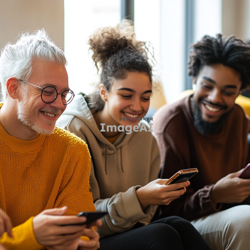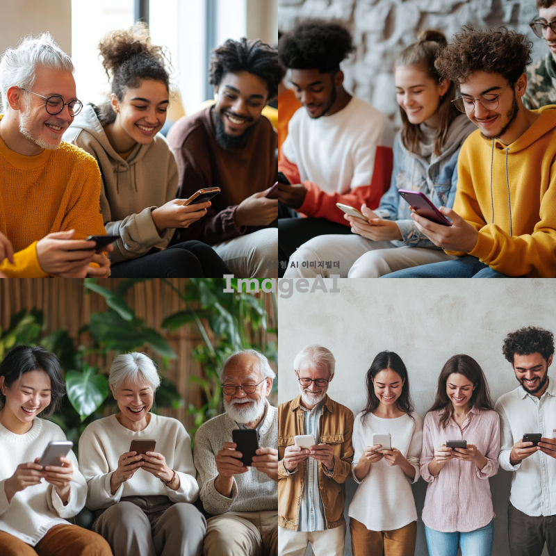밝고 현대적인 배경에서 다양한 연령과 인종의 사람들이 함께 웃으며 스마트폰을 사용하는 모습. 사람들은 테크놀로지의 혜택을 즐기고 있으며, 주변에는 디지털 기기들이 자연스럽게 배치되어 있어 기술의 혁신적인 사용을 강조. 각 인물은 편안하고 스타일리시한 옷을 입고 있으며, 전반적으로 긍정적이고 활기찬 분위기를 전달.
