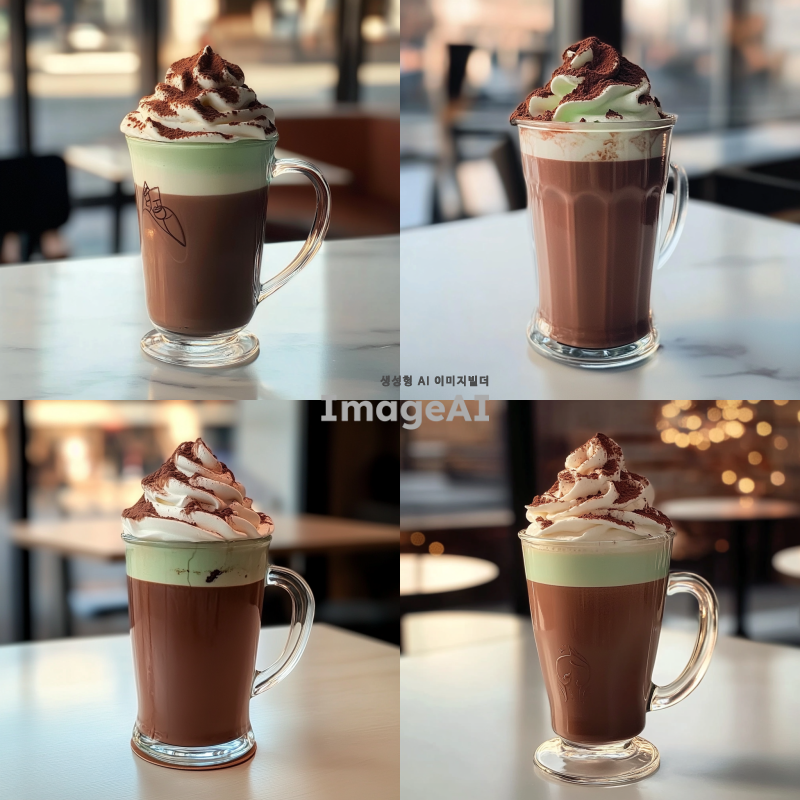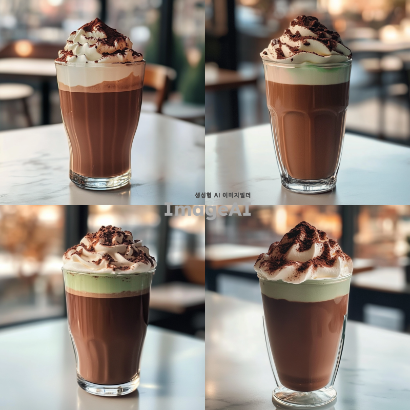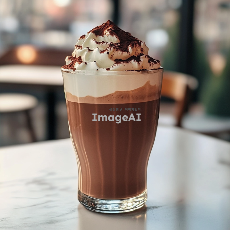 투명한 유리잔에 담긴 초콜릿라떼, 부드럽고 진한 초콜릿 색상이 돋보이며, 잔 위에는 부드럽고 풍성한 하얀 크림이 얹혀져 있다. 크림 위에는 살짝 갈색의 초콜릿 가루가 뿌려져 있으며, 주변에는 따뜻하고 아늑한 분위기를 연출하는 조명이 비치고 있다. 배경은 카페 내부의 아늑한 느낌으로, 흰색 테이블 위에 놓여 있는 모습.