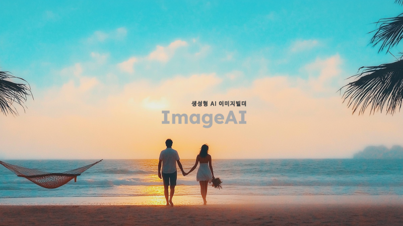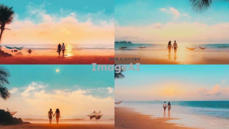 석양이 지는 해변에서 손을 잡고 걸어가는 커플, 주변에는 야자수 나무가 늘어서 있고 해먹이 걸려 있는 모습, 따뜻한 색감과 부드러운 분위기, 바다의 잔잔한 파도 소리와 함께 평화로운 장면.