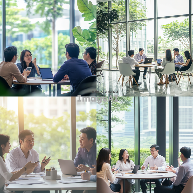 동양인 비즈니스 회의, 현대적이고 세련된 사무실 환경, 다양한 연령대와 성별의 사람들이 테이블에 둘러앉아 토론 중, 창의적인 아이디어를 공유하는 모습, 자연광이 들어오는 넓은 창문, 깔끔하고 전문적인 분위기, 스마트폰과 노트북 사용, 협력과 혁신을 강조하는 장면.