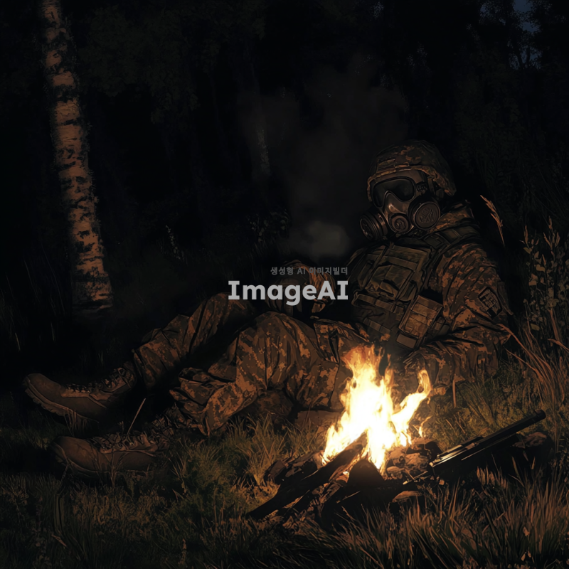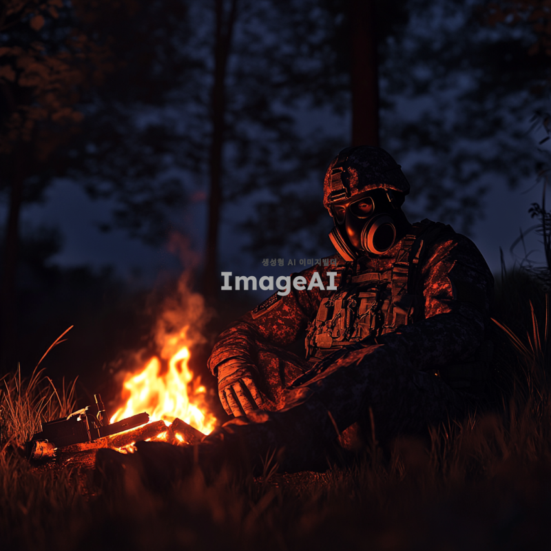 방독면을 쓴 군인이 군복을 입고 총을 옆에 두고 모닥불 앞에 앉아 쉬고 있는 모습, 어두운 밤 배경, 불빛에 비치는 군인의 자세한 디테일, 주변에 나무와 풀로 이루어진 자연 환경, 따뜻하고 고요한 분위기.